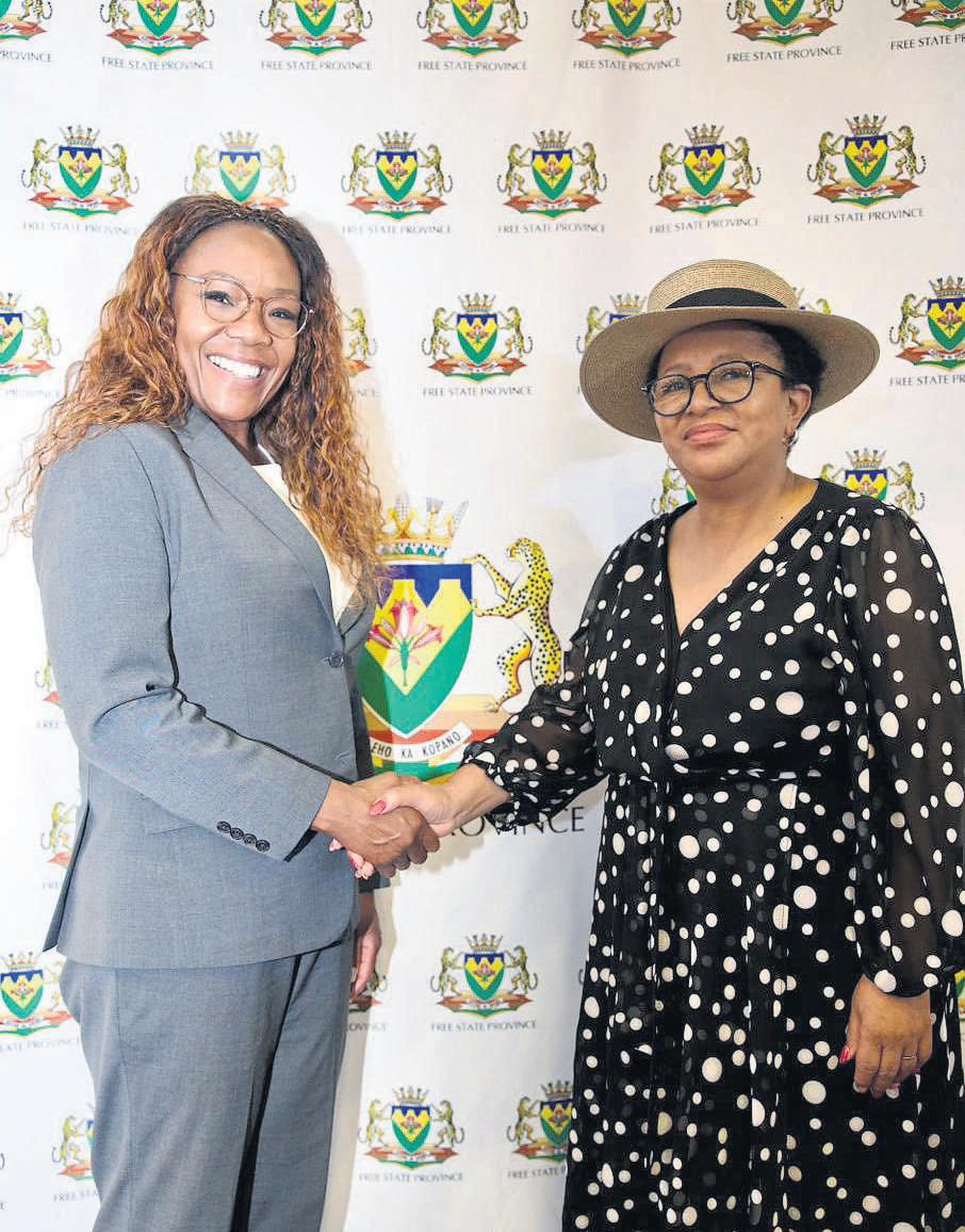 Auditor-General Tsakani Maluleke (left) shaking hands with Premier Maqueen Letsoha-Mathae at the Auditor-General of South Africa’s (Agsa) roadshow in Bloemfontein on Wednesday Photo: Supplied