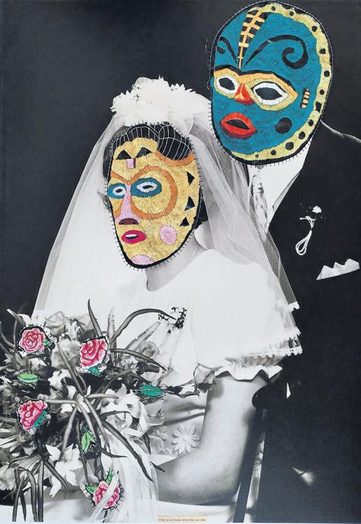 imaginary fairy-tale kingdom by removing the faces and historical identities from these vintage photographs; as she replaces them with a variety of cultural masks stitched onto rubber with colourful embroidered flowers, a new fantasy emerges. Something for a world clinging to the need to believe in euphoria.