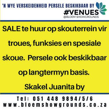 Inskrywings oor konserte, kuns- en leefstylwerksessies optredes van kunstenaars en gassprekers, vroue-oggende, manne-aande en ander geleenthede ten bate van niewinsgewende organisasies word gratis in BloemNuus se dagboek geplaas Stuur inskrywings met volledige inligting, asook kontakname en -nommers, voor Maandae om 12:00 per WhatsApp na083 709 0809, of stuur ’n e-pos met inligting na lientjie mentz@ novusmedia co za