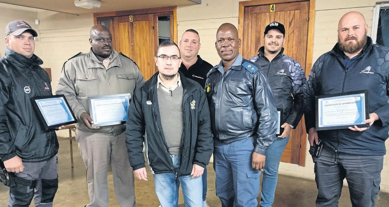 Tokensofappreciationwerehandedouttosecuritymembersthatareactivein Fleurdal,Uitsig,andGenl deWet Theyare,fromtheleft,RikusSlabbertofBloemsec,SylvesterMohyokare(FedilityADT),MarshallNeyhchyens(DeFleurSig), JohanMaritz(SecuriForce),Lt.ColEseuMphirime,TiaanSnyman,andJeandré Swarts(ofSenforce) Photo: Lientjie Mentz