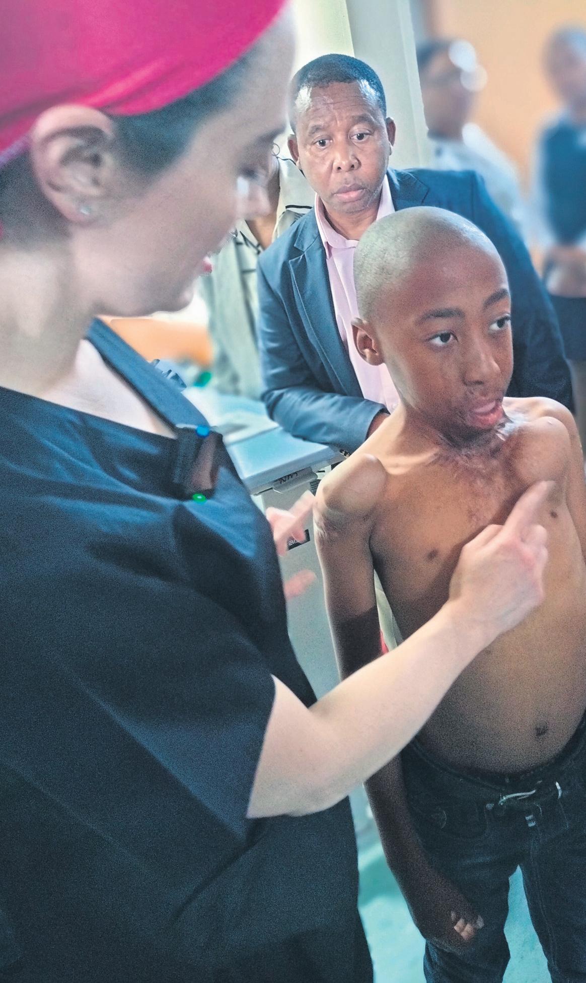 Smile-week vind hierdie week by die Universitas- Akademiese Hospitaal plaas. Een van die kinders wat vandeesweek weer deel van die week is, is Kananelo Mokoena (11) van Sasolburg wat rekonstruktiewe chirurgie ontvang. Tydens die vorige Smile-week in September verlede jaar is twee weefsel-uitdyers in sy skouer en bors ingeplant, wat nou gebruik gaan word om die letselweefsel aan sy nek te vervang sodat hy vir die eerste keer in jare weer sy nek vrylik kan beweeg. Hier verduidelik dr. Nikita Blake, senior rekonstruktiewe chirurg by Universitas hoe die rekonstruksie werk. Die woordvoerder van die Departement Gesondheid Mondli Mvambi kyk toe. Lees die volledige berig op BloemNuus se gratis blad op Netwerk24. FOTO: LIENTJIE MENTZ