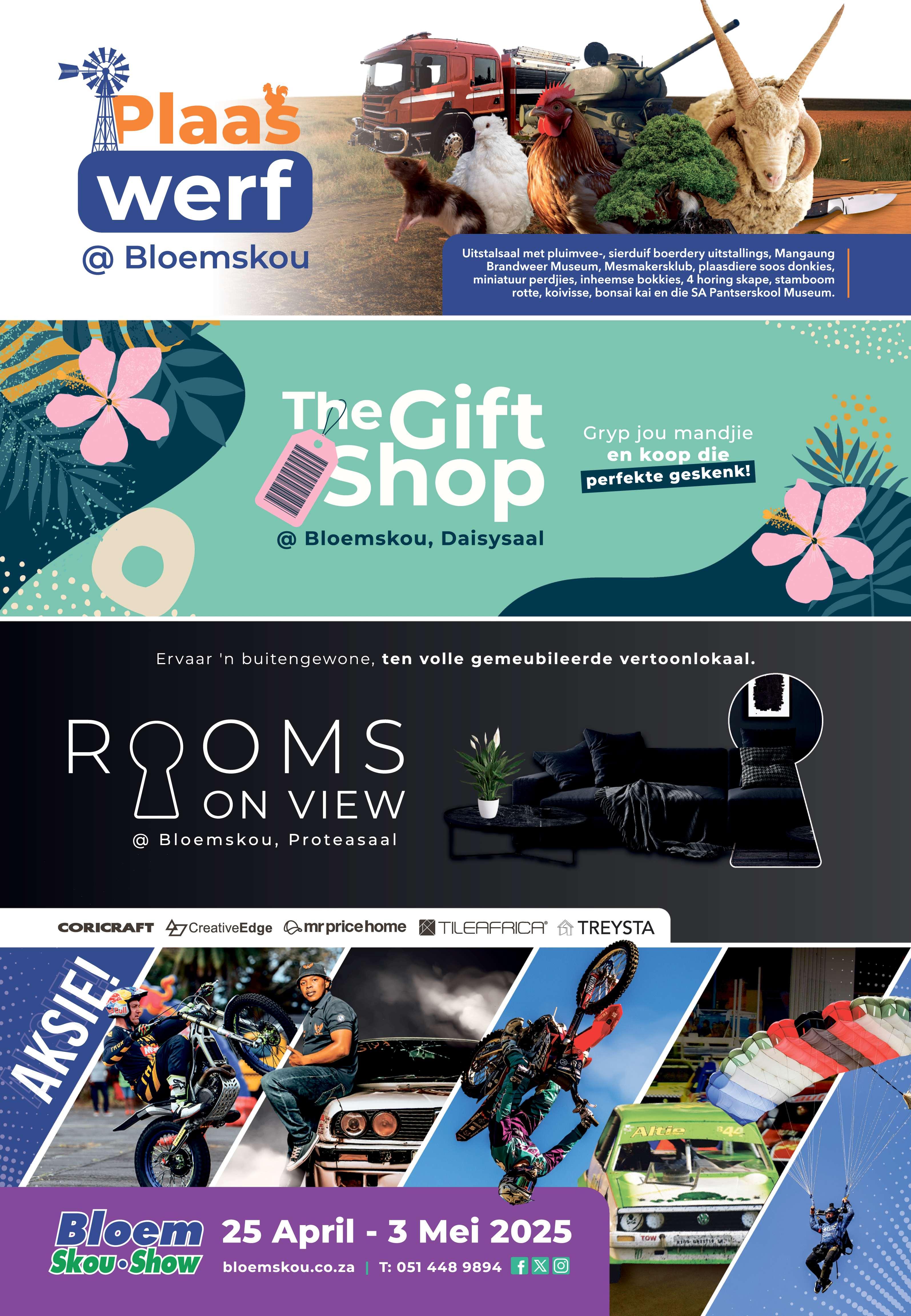 toegangskaartjie gratis toegang tot alle kunstenaars in Met meer as een top-kunstenaar per aand, maak dit Bloemskou ’ n bekostigbare vermaakopsie in Bloemfontein Ander vermaak sluit in die FMX motorfiets-waagvertonings en vuurdansers, liggaamsbou, sterkmankompetisie en armdruk-kompetisies, afslaerskompetisies, skaaphondratsheidsvertonings, ’ n dansextravaganza deur plaaslike dansskole, ’ n vroueoggend met Donnalee Roberts en Ilse du Preez, ’ n gelukbringerresies (mascot), valskermspringers, ovaalbaan wedrenne en -spinning, asook ’ n unieke Hoefsmid Interprovinsiale Kampioenskap Dit behels drie klasse waarin daar vir twee perde ‘skoene’ gemaak word op die tradisionele manier met vuur en yster Die modeparade vind Sondag 27 April plaas met 40 modelle wat ontwerpersklere sal vertoon Spesiale voorafafslag op pretparkkaartjies is slegs beskikbaar tot vandag om 17:00 Kom geniet ’ n onvergeetlike skou – 25 April – 3 Mei by Bloem-skougronde Besoek www bloemskou co za vir meer inligting