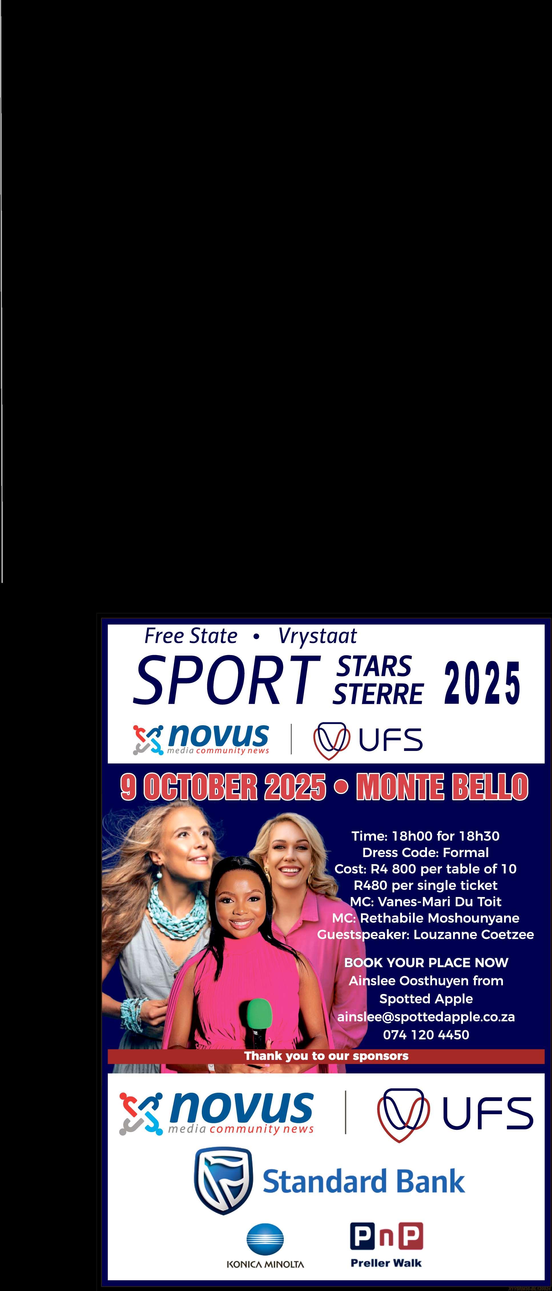 ■Inskrywings oor konserte, kunsen leefstyl-werksessies, optredes van kunstenaars en gassprekers, vroue-oggende, manne-aande en ander geleenthede ten bate van niewinsgewende organisasies word gratis in BloemNuus se dagboek geplaas Stuur inskrywings met volledige inligting, asook kontakname en -nommers, voor Maandae om 12:00 per WhatsApp na083 709 0809, of stuur 'n e-pos met inligting na lientjie mentz@novusmedia co za