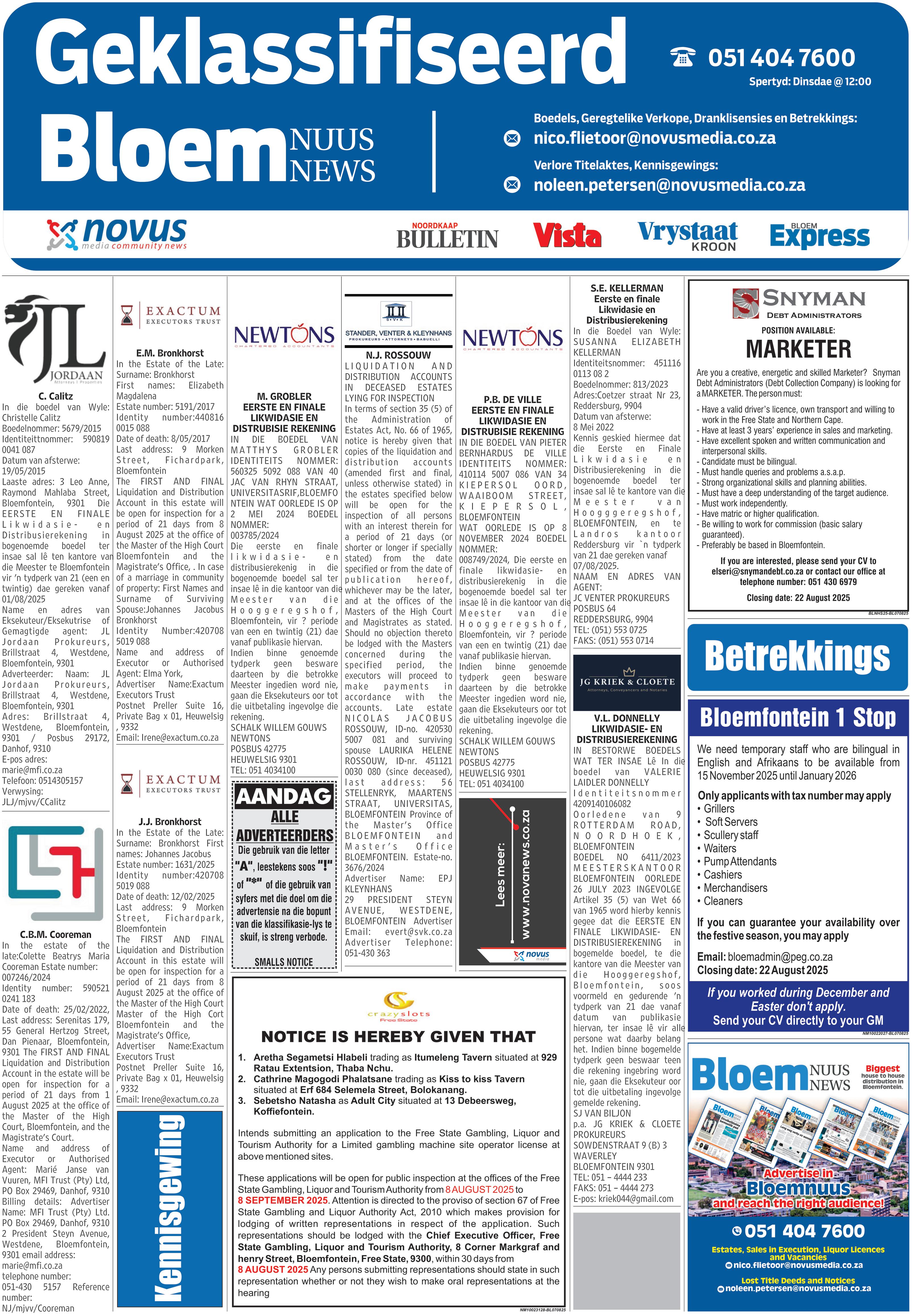 All interested persons having objection to the issue of such copy are hereby required to lodge the same in writing with the Registrar of Deeds at BLOEMFONTEIN within two weeks from the date of publication of this notice. Dated at BLOEMFONTEIN on this 4th day of AUGUST 2025. BEZUIDENHOUTS INC. 104 KELLNER STREET WESTDENE BLOEMFONTEIN Per: MARIKA VAN HEERDEN E-mail: deeds@bezuidenhouts.co.za Tel: 051 448 9755