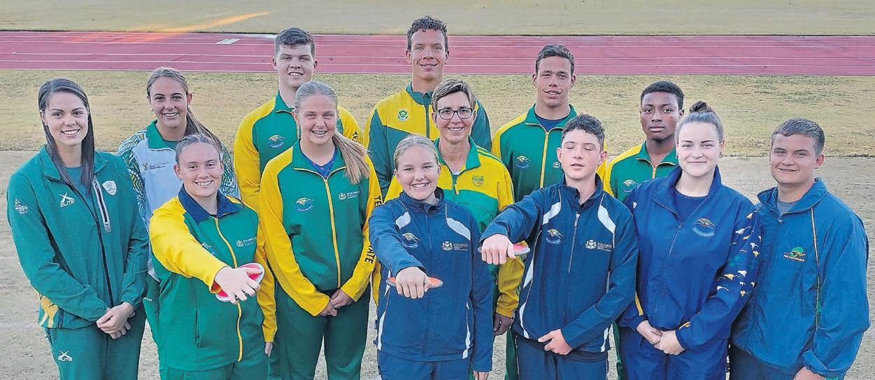 Elizna Pretorius se atlete is van links,voor: Mareli Earle; tweede ry: Marli Jacobs,Iske le Roux,Elizna Pretorius (afrigter),Nehan Vermaak,Judith Watson en Wian Bredenkamp; agter: Yolandi Stander,Tyla Wasmüth,Conrad van der Zwaard,Aron Alvarez Aranda, W M Pretorius en Teboho Motloung Foto: Lientjie Mentz