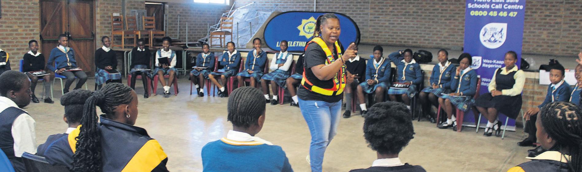 Lingelethu-West police spokesperson Sgt Xoliswa Nyalambisa talking with the learners PHOTO: UNATHI OBOSE