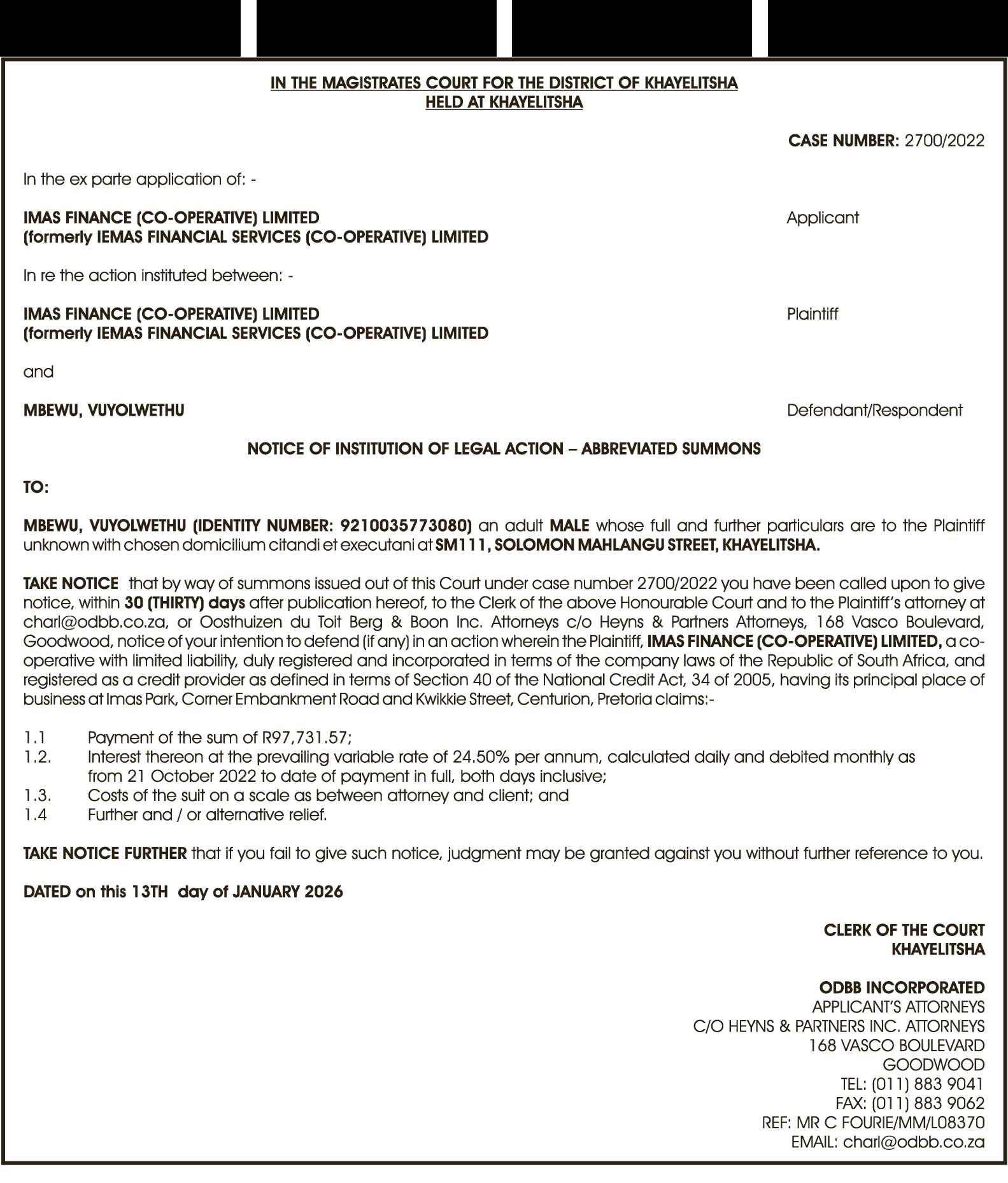 TheDepartment of Social Development, Langalocal office is requesting Saphokazi Maqabela lastseenin Langa to urgently contact socialworker, MS. R. Lucas at (021) 8158431oratC Harlem& Bennie Street,Nomzamo Building,Langa during office hours (07H30– 16H00) Mon –Fri. She is allegedly acloserelative of afemale child born during2007.