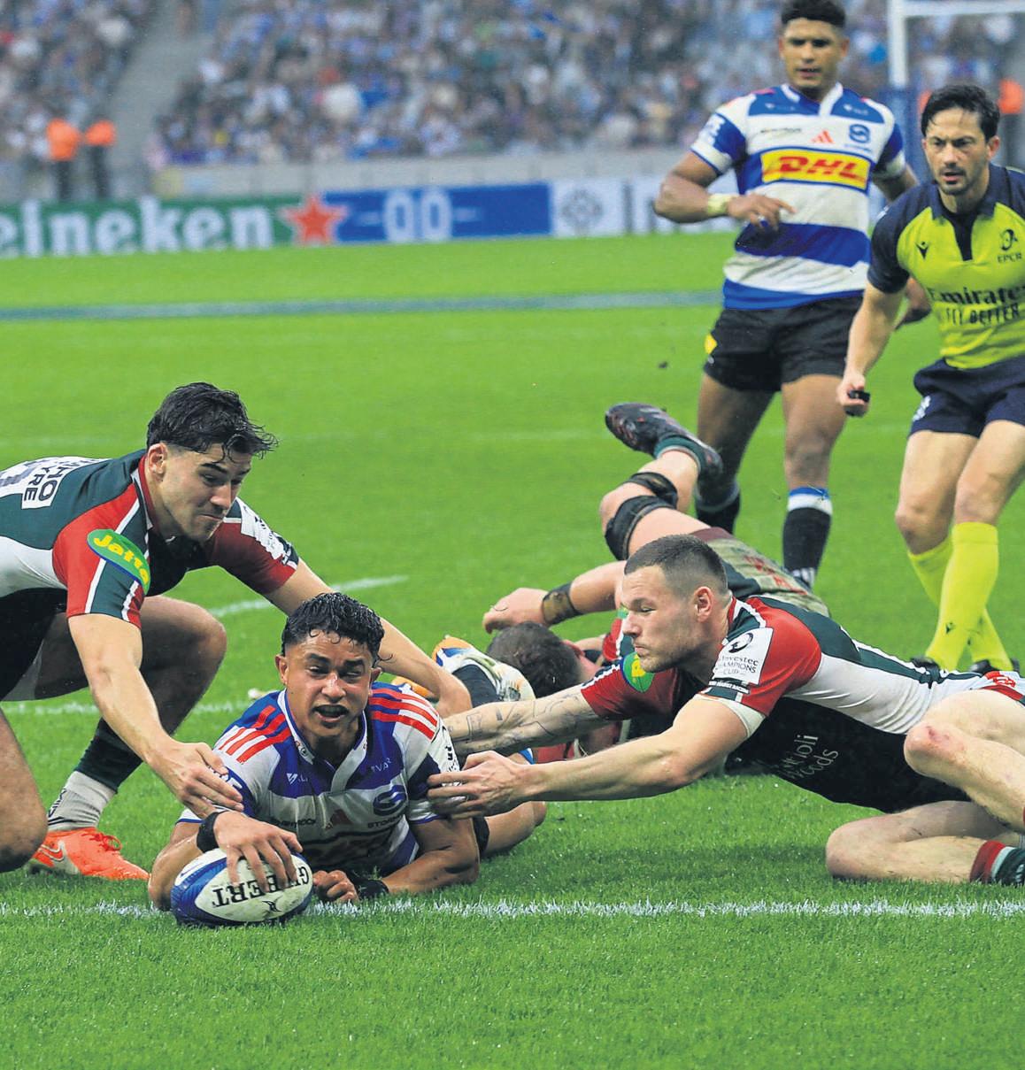 Lansdowne resident and StormersplayerImaad Khan beatsthe attention of George Pearson, left;and Gabriel Hamer-Web of LeicesterTigersto scorehis team’sfifthtry of the match to win 39- 26 during the Investec ChampionsCup match played at the Cape Town StadiumonSaturday17 January