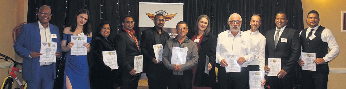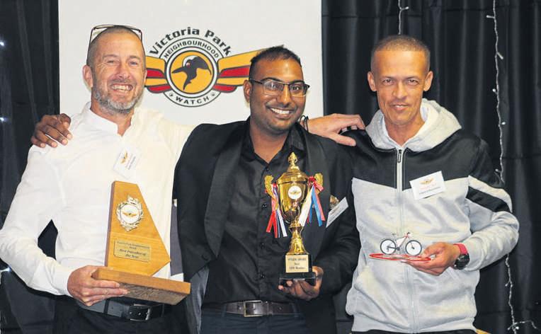 Victoria Park Neighbourhood W its prestigious Awards Gala Ev set West Town Hall on Saturda dedicated patrollers, including Boodhraj and Edward Baartma recipients honoured at the eve the contributions of members alike Fouche was named Patro Boodhraj was named Neighbo ber of the Year Baartman was Bicycle Patrol Award. Photos: Jame