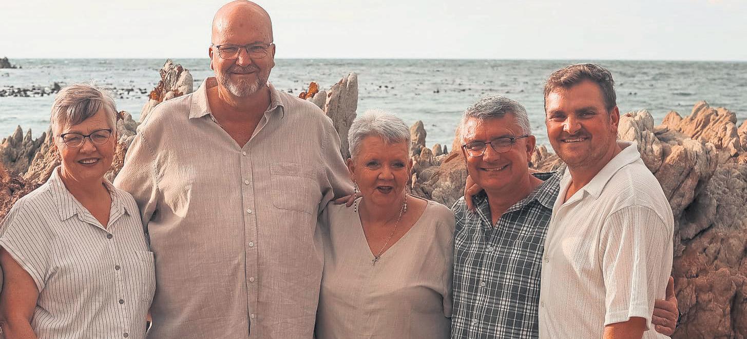 Die gesinslede wat gered is nadat hul boot by Gordonsbaai omgeslaan het, van links is Cristine Bailey, Andrew Camphausen, Petro Camphausen, Clint Bailey en Cullen Bailey. Afwesig: Natasha Heaney
