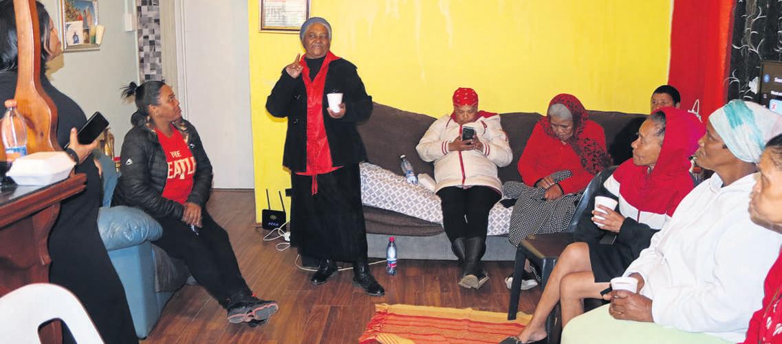 Die Maranatha-sopkombuis het Vrouedag (Saterdag 9 Augustus) gevier deur pasiënte en bejaardes in Erijaville, Strand, met iets te ete te voorsien Vanweë Saterdag se reën is die sopkombuis vinnig verskuif nadat Esmeralda Toerien haar huis beskikbaar gestel het om te verseker dat die vroue ’n aangename dag kon hê Begunstigdes van die Maranatha-sopkombuis se heerlike middagete en malvapoeding (van links) is Mary Fortuin, Theresa Jaftha, Bessie Lefleur en Elsabé Regina Pieterse Foto: Barend Williams