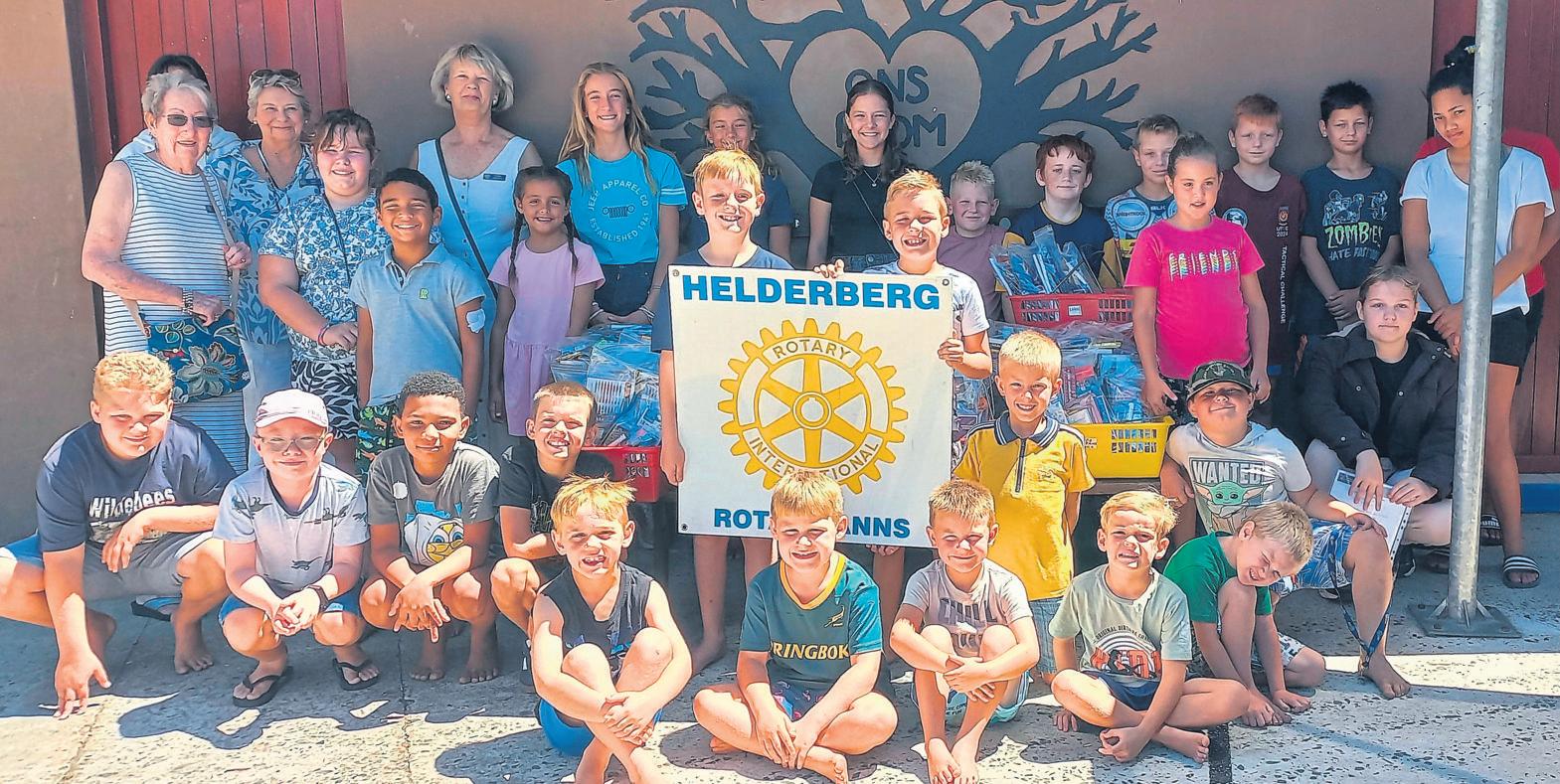 Community members help learners “rule” the new year Kinders van die nasorgprogram van Ons Plek Helpende Hand was slaggereed om die nuwe akademiese jaar danksy ’n skryfbehoefteskenking ter waarde van R16 000 van die Helderberg Rotary Anns te begin. Die pakkies, wat voor die begin van die nuwe skooljaar aan die kinders en die sentrumbestuurder, Joey Lötter, oorhandig is, het ’n verskeidenheid skryfbehoeftes, soos sakrekenaars, skryfboeke, potlode, penne, wiskundestelle, vetkryt en meer ingesluit. Rotary Anns (van links) Carol Vader, Gayl Boone en Mieke MacDonald het die skenking oorhandig.