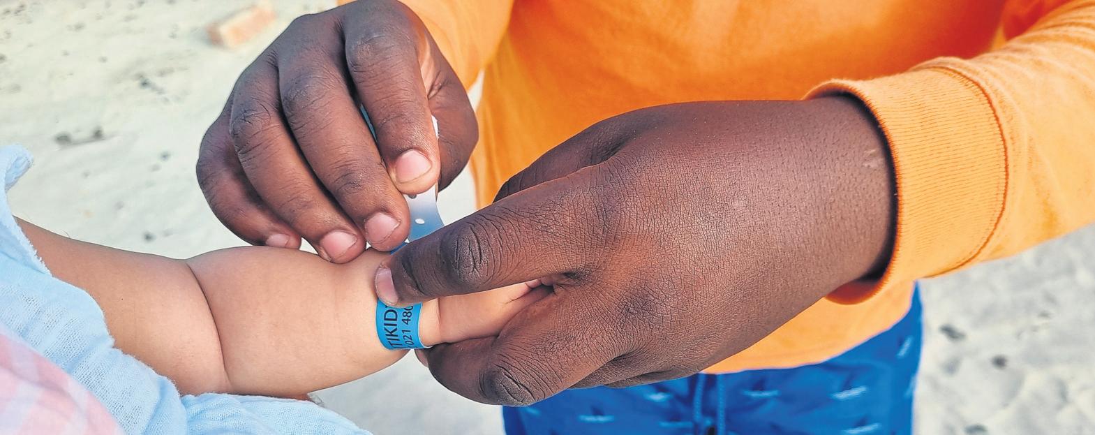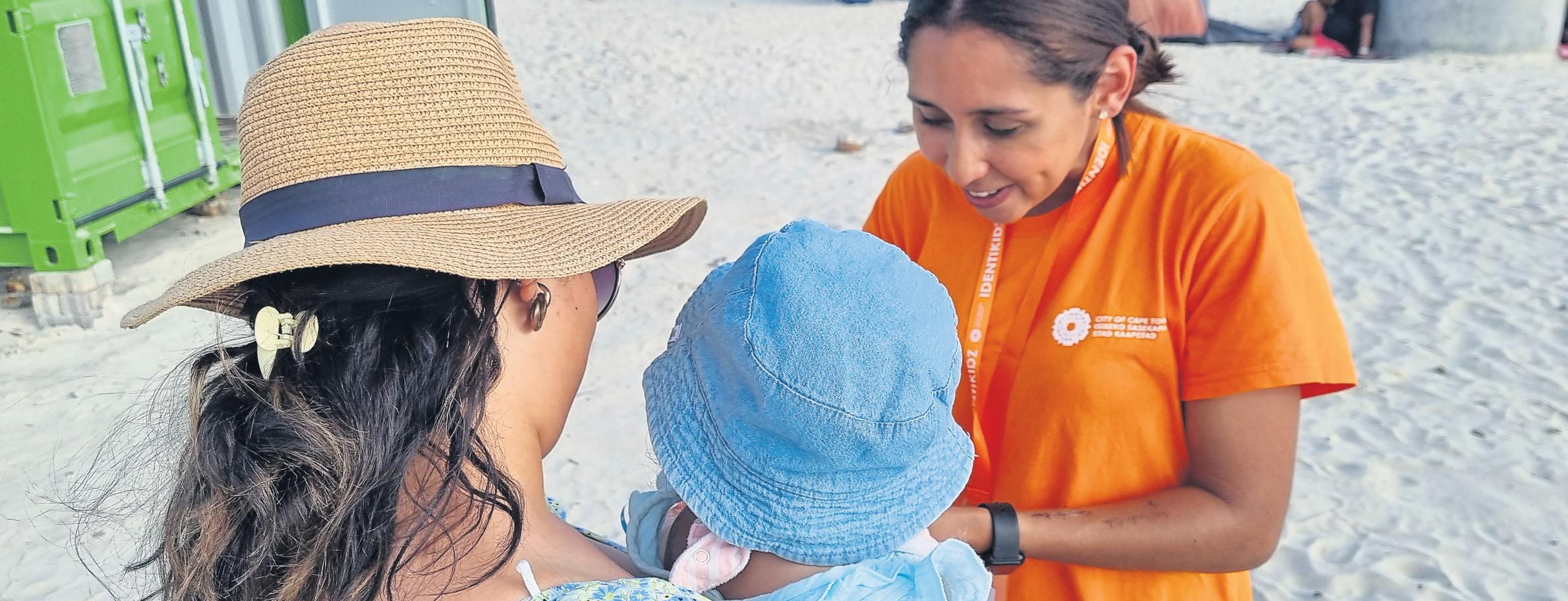 An Identikidz staff member ensures that a toddler is tagged, with permission of her mother, on one of the local beaches this festive season.