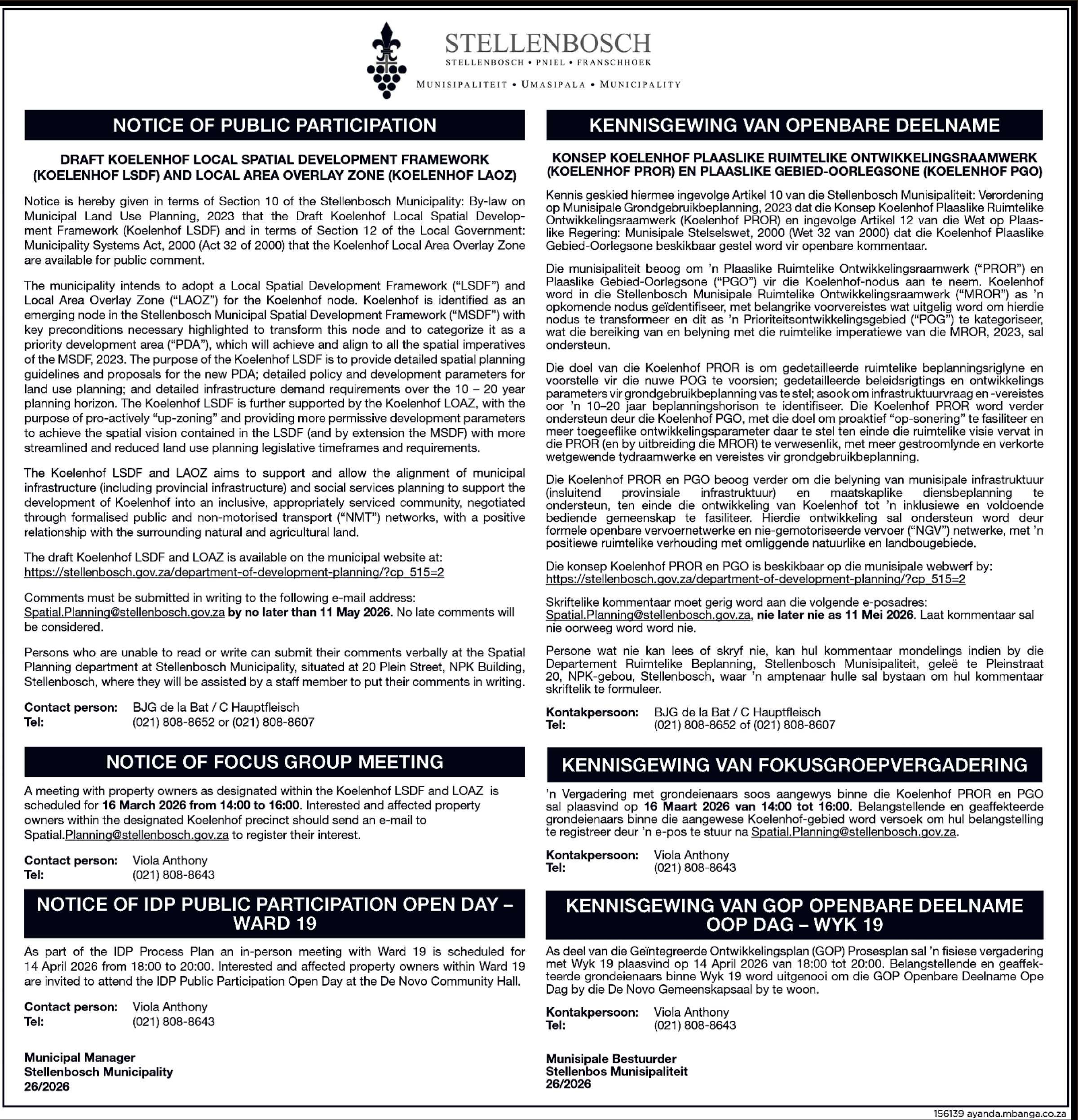 Raadslid Marius van Stade, van Good,het gesê verantwoordbare bestuurbeteken diemunisipaliteit moet na diepublieksekommentaar oordie voorgestelde veiling luister. “Ons sien uitnadie publieke insaedeurdie openbare-deelnameproses,”het hy gesê Sy party hetaangedui hy sal enigekritiek en kommentaar houtotdatdie proses voltooi is