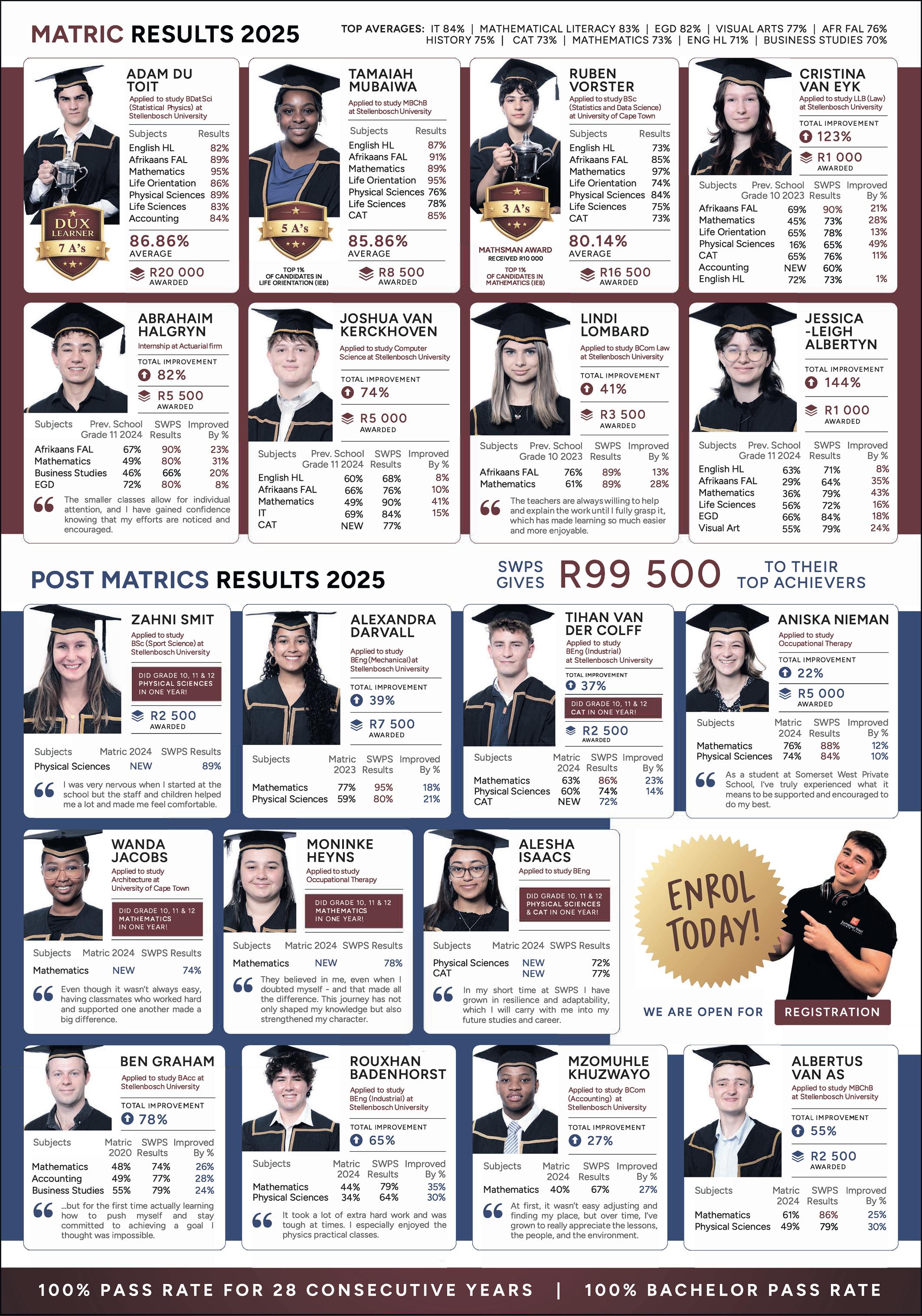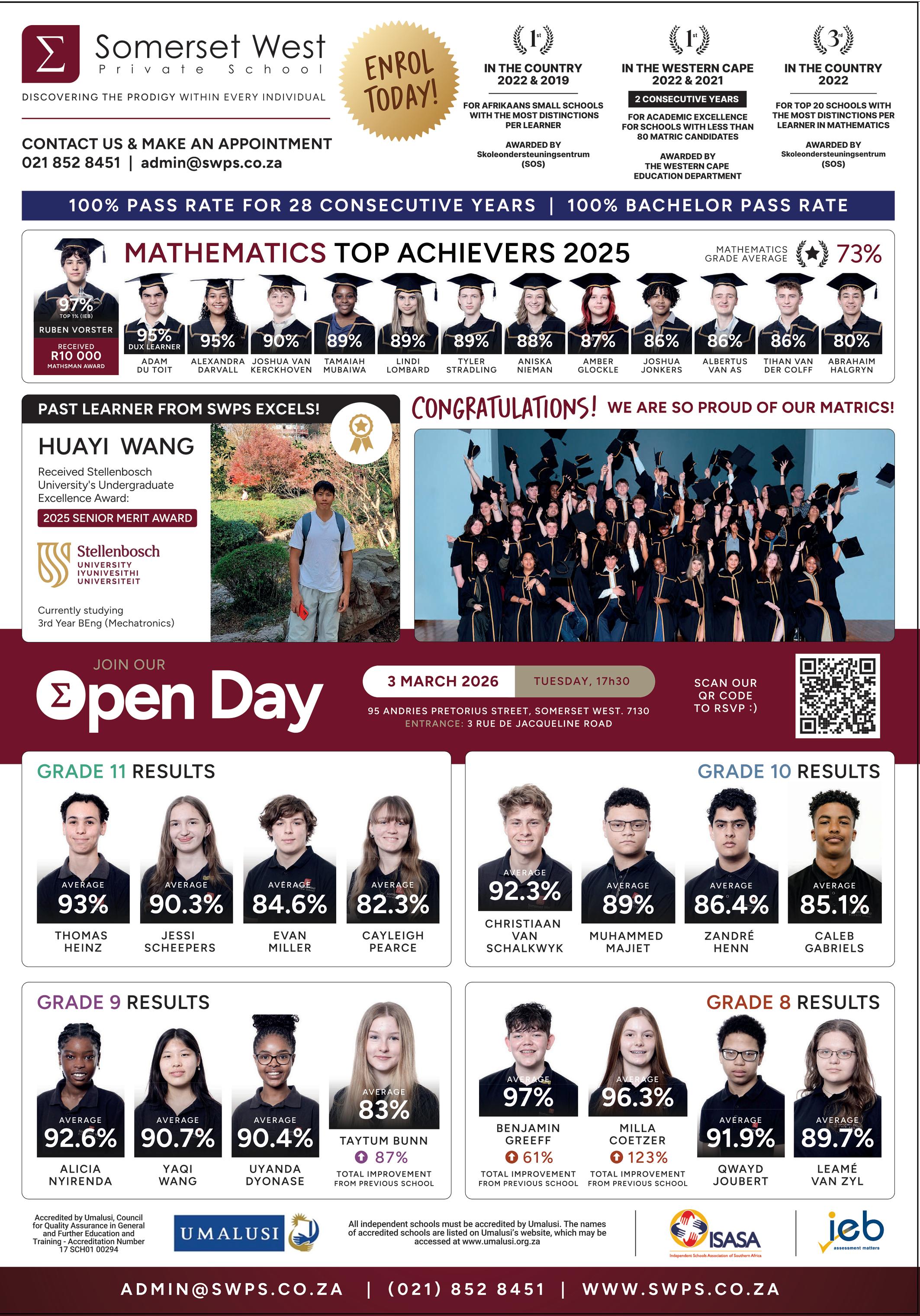 Somerset WestPrivateSchool (SWPS) proudlycelebrated anotheryear of exceptional academic achievement, with its matric class of 2025 achieving a100% pass rate in the Independent Examinations Board (IEB) National Senior Certificate examinations for the 28thconsecutive year.