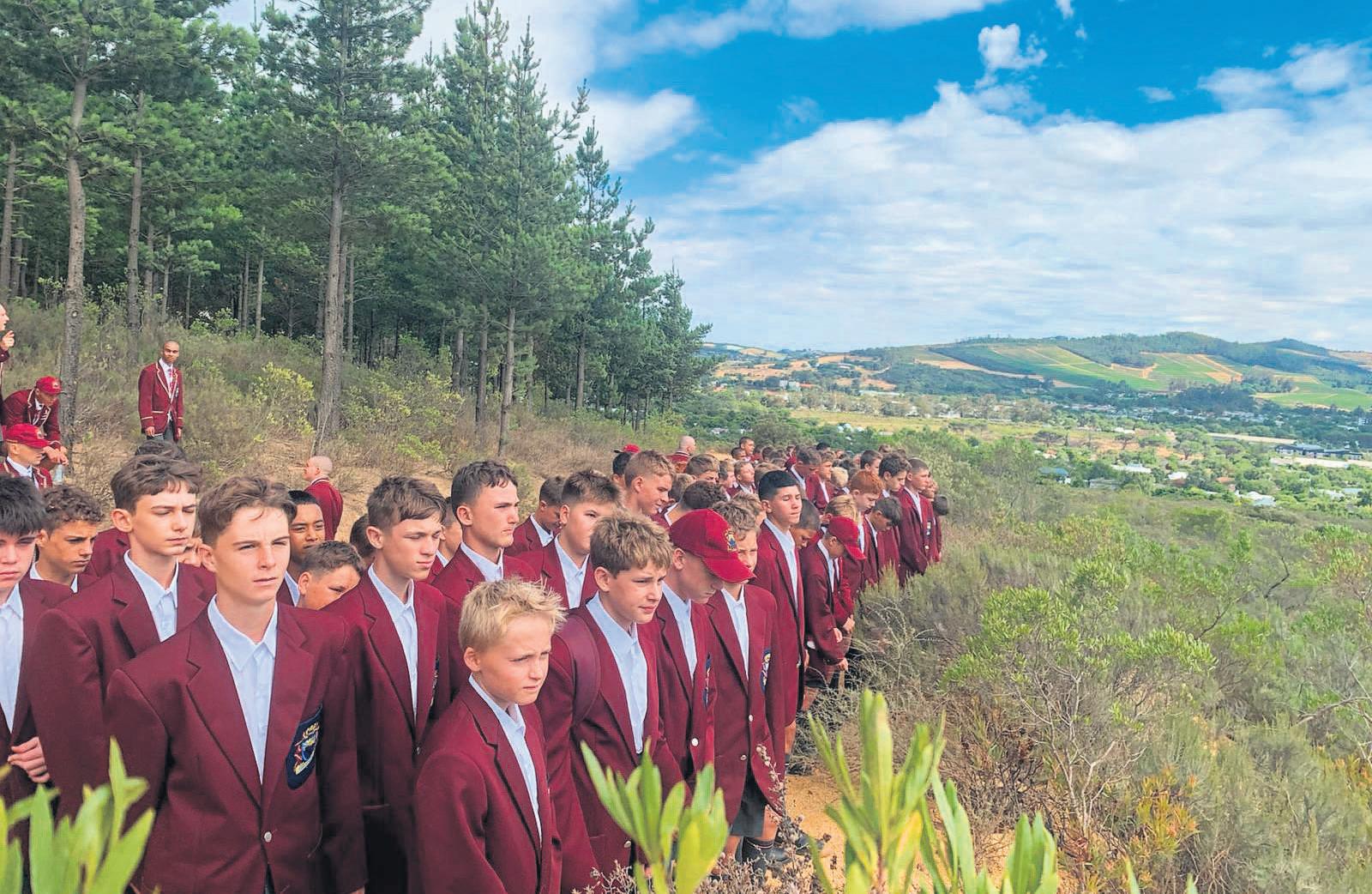 Dienuwegr.8-leerdersvan Paul Roos Gimnasium het verledeweek meer as net ’n berg versit. Hulle het totbydie eerstekruisgestap waar die skool se onderhoofleiers Psalm 121voorgelees het.Daarna het die hoofseun Daniel Whitehead virdie nuwelingedie PRG-embleem geleer en hulle het self die pieke, soos op die embleem getoon word,gesien.