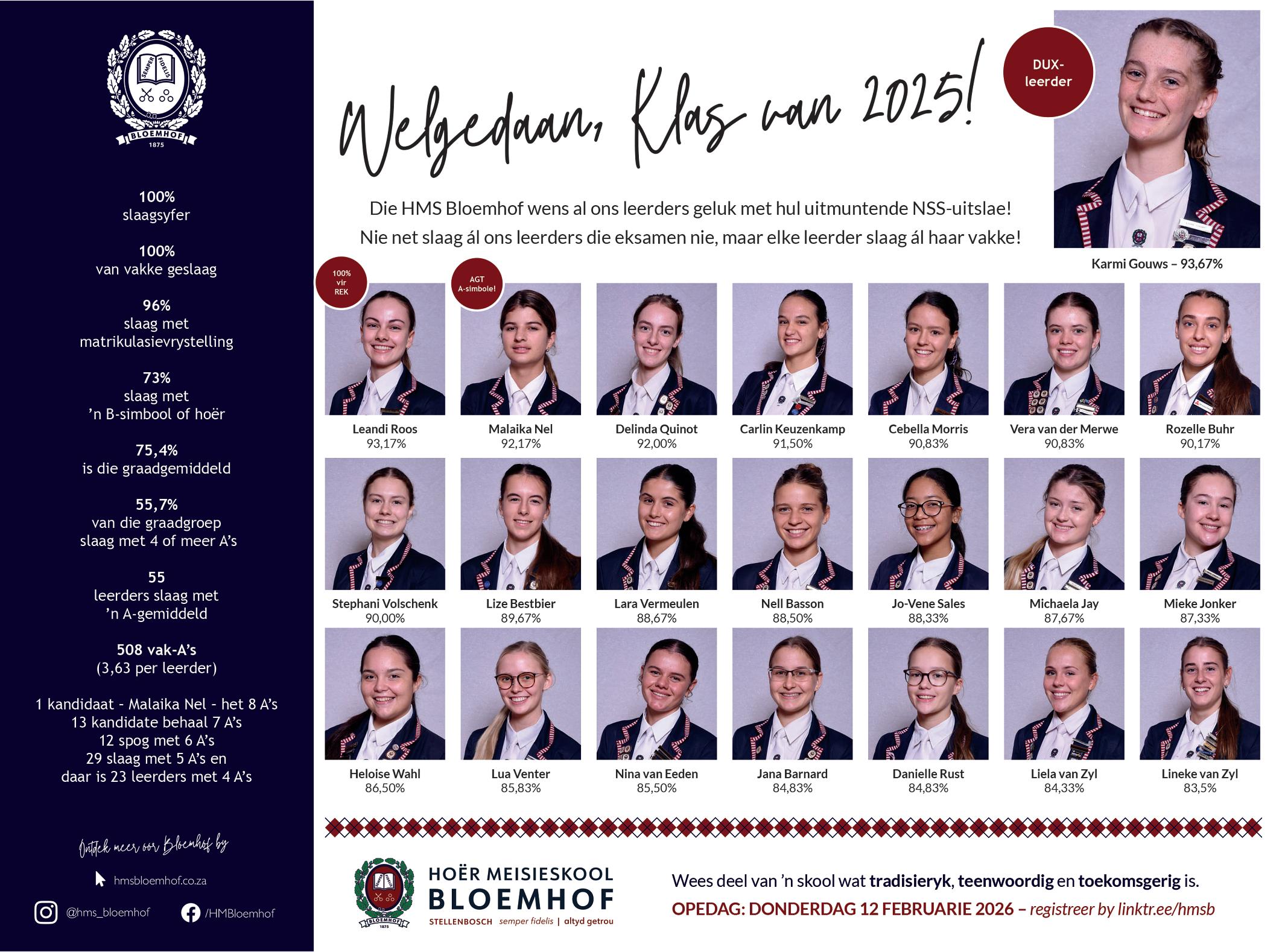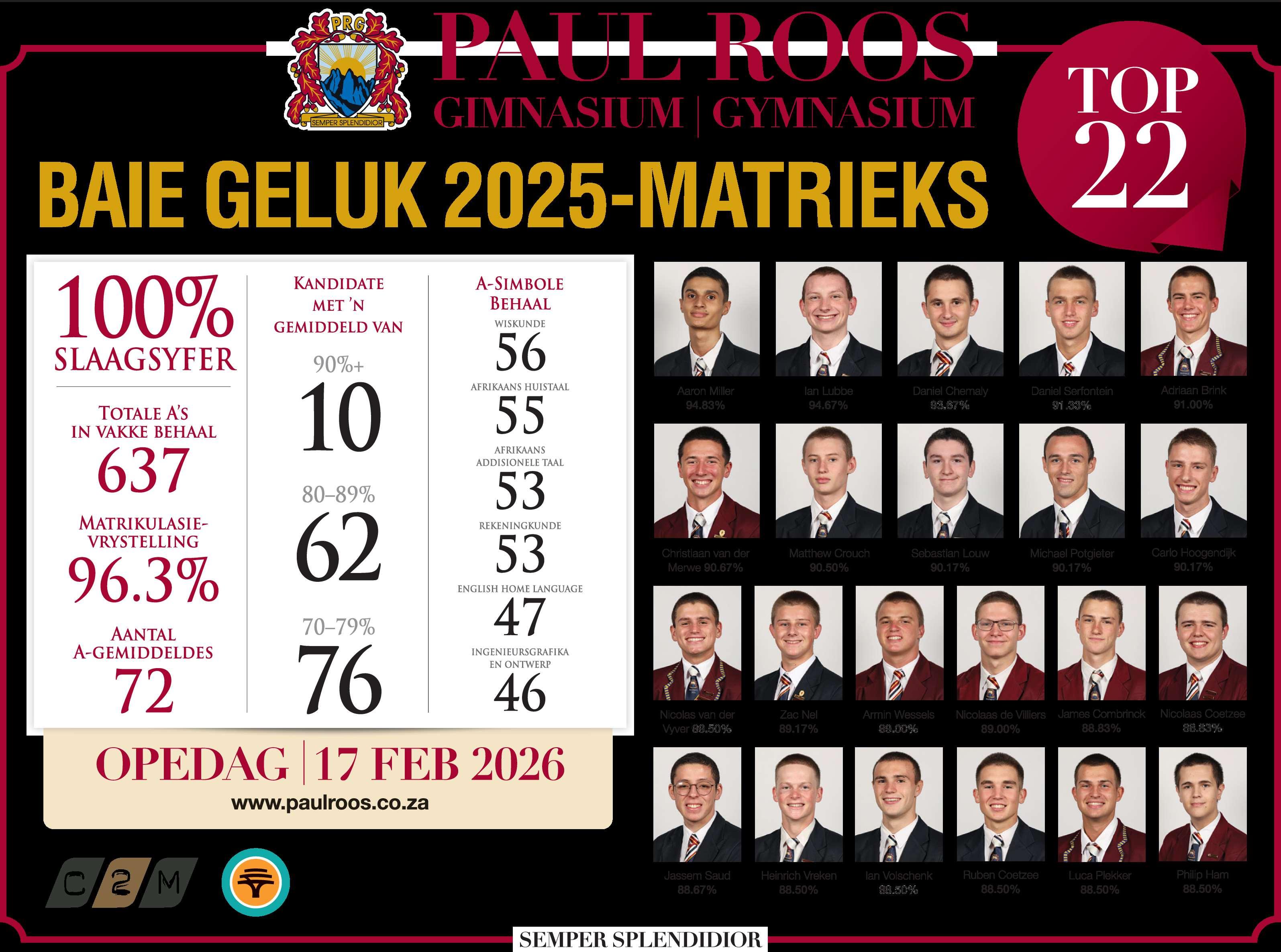Die Hoërskool Stellenboschsebestematrikulantevan 2025 spog metpuik uitslae in die nasionalematriekeksamen. Die skool se drie topleerders is, vanlinks, Jana Kotzé(tweede plek), Marinus Toerien (eerste) en Kaylee Botha (derde). Marinus, watook die skool se Dux-leerder is, se raad aan vanjaar se matrikulanteis: “Benut elkegeleentheid en genietjou laaste skooljaar tenvolle.Die tydvlieg verby, daarom is dit belangrik om jou tydwys te gebruik. Leef ’n gebalanseerde lewe,gee jou besteinalles wat jy aanpak en sluit die somvan 12 jaar se harde werk op ’n hoogtepunt af –sonderenigespyt.” Met ’n 93,17%-gemiddelde vir sy eindeksamen weet Marius gewis waarvanhypraat.Jana het’n gemiddeldevan 90,33% behaal danskyhaar ses A’s, en Kaylee hetvyf A-simboleopgelewer om haar ’n 89,33% gemiddeldetegee.