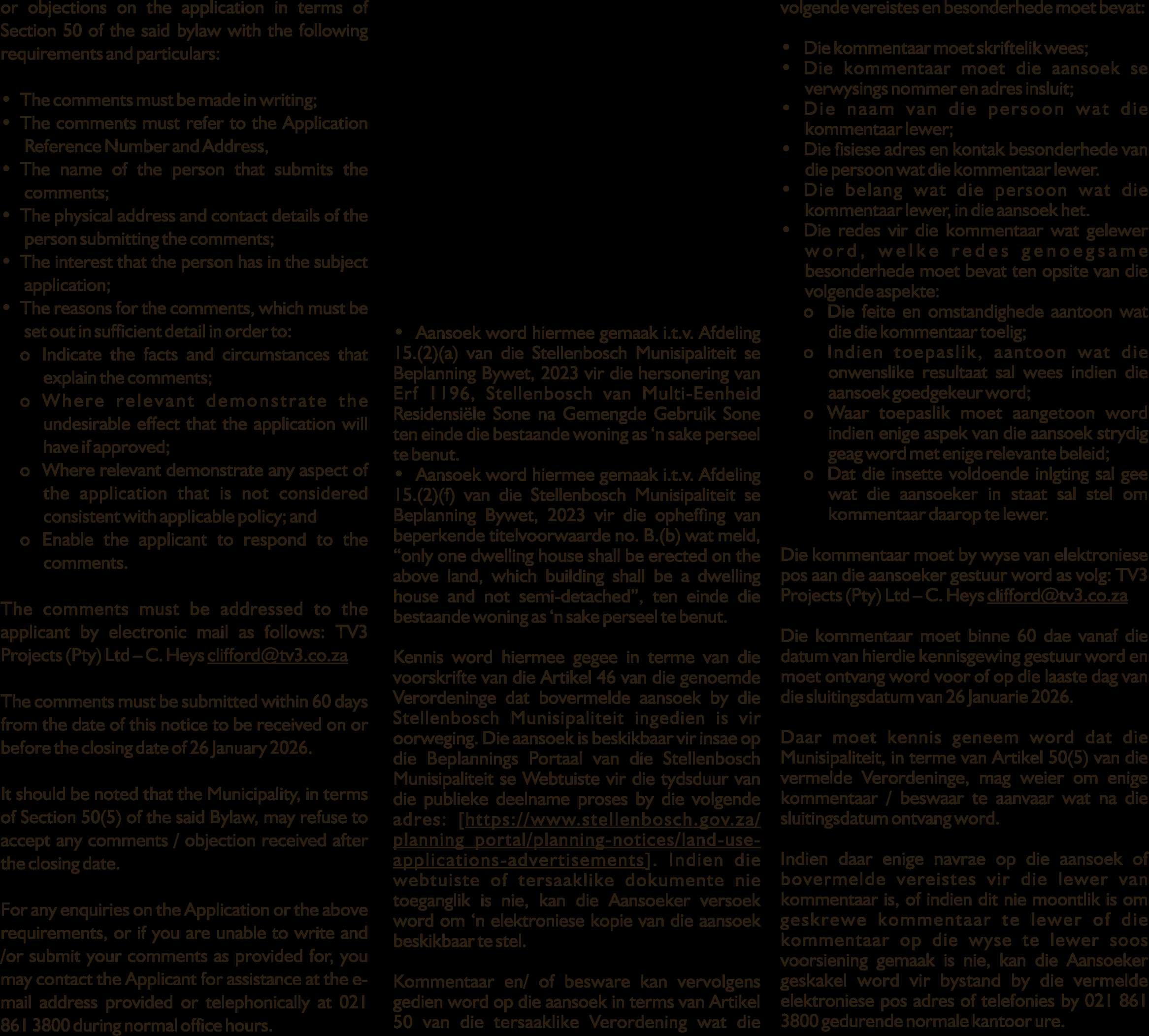 Kennis word hiermee gegee in terme van die voorskrifte van die genoemde Verordeninge dat bovermelde aansoek by die Stellenbosch Munisipaliteit ingedien is vir oorweging. Die aansoek is beskikbaarvirinsaeopdieBeplanningsPortaalvandieStellenboschMunisipaliteitseWebtuistevir dietydsduurvandiepubliekedeelnameprosesbydievolgendeadres: https://wwwstellenbosch govza/planning/documents/planning-notices/land-use-applicationsadvertisements. Indien die webtuiste of tersaaklike dokumente nie toeganglik is nie, moet die Aansoekerversoekwordom‘nelektroniesekopievandieaansoekbeskikbaartestel. Kommentaaren/ofbeswarekanvervolgensgedienwordopdieaansoekintermsvanArtikel50van die tersaaklike Verordening. Skriftelike kommentaar, wat besonderhede ten opsigte van die verwysings nommer van de aansoek, die name, fisiese adres en kontak besonderhede van die persoon wat die kommentaar lewer die redes vir die kommentaar en die belang van die persoon wat die kommentaar lewer in die aansoek, by die Aansoeker ingedien word by wyse van elektroniese pos as volg: Marike Bolz, carlien@archtownplanners.co.za Deur 'n beswaar, kommentaarofvertoëterig,erkendiepersoonwatditdoendatinligtingaandiepubliekenaandie aansoekerbeskikbaargestelkanword.