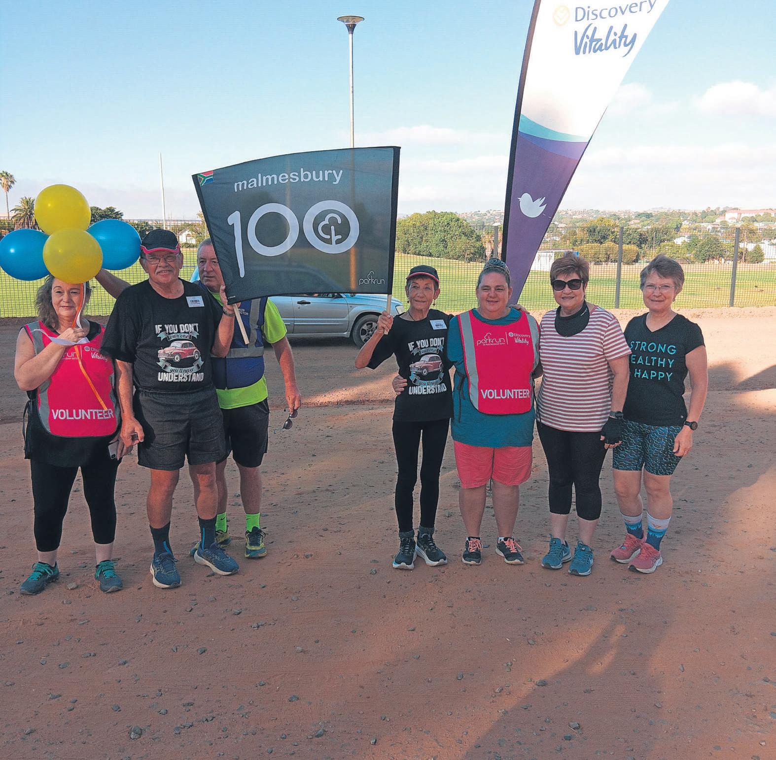 Wilna Reynders(Park Runbeampte),RichardLaubscher,JacoRoestof (hoofdirekteur: MalmesburyPark Run), BerthaLaubscher,Erika du Preez(Park Runbeampte),haar seun Jaco watook sy 100stePark Run voltooi het,asook Marie vanDyk en Elna Humanwat elk ook hul 100steParkRun voltooi het en familie is vanRichard en Bertha