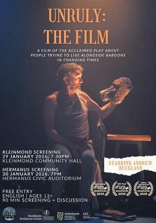 gebeur nadat die matriarg van ’n plaaslike bobbejaantrop verdwyn het. Deur gebruik te maak van humor ondersoek die fliek die verhouding tussen mens en dier, die spanning wat binne gemeenskappe ontstaan en botsende menings in die gemeenskap. Die fliek is in Engels, geskik vir ouderdomme 13 en ouer, en elke vertoning word gevolg deur ’n bespreking met die navorsingspan. Gratis vertonings sal in die Overstrand plaasvind: Kleinmond: Donderdag 29 Januarie om 19:30 in die Kleinmond-gemeenskapsaal; Hermanus: Vrydag 30 Januarie om 19:00 in die ouditorium. Besoek www.unrulynatures.com