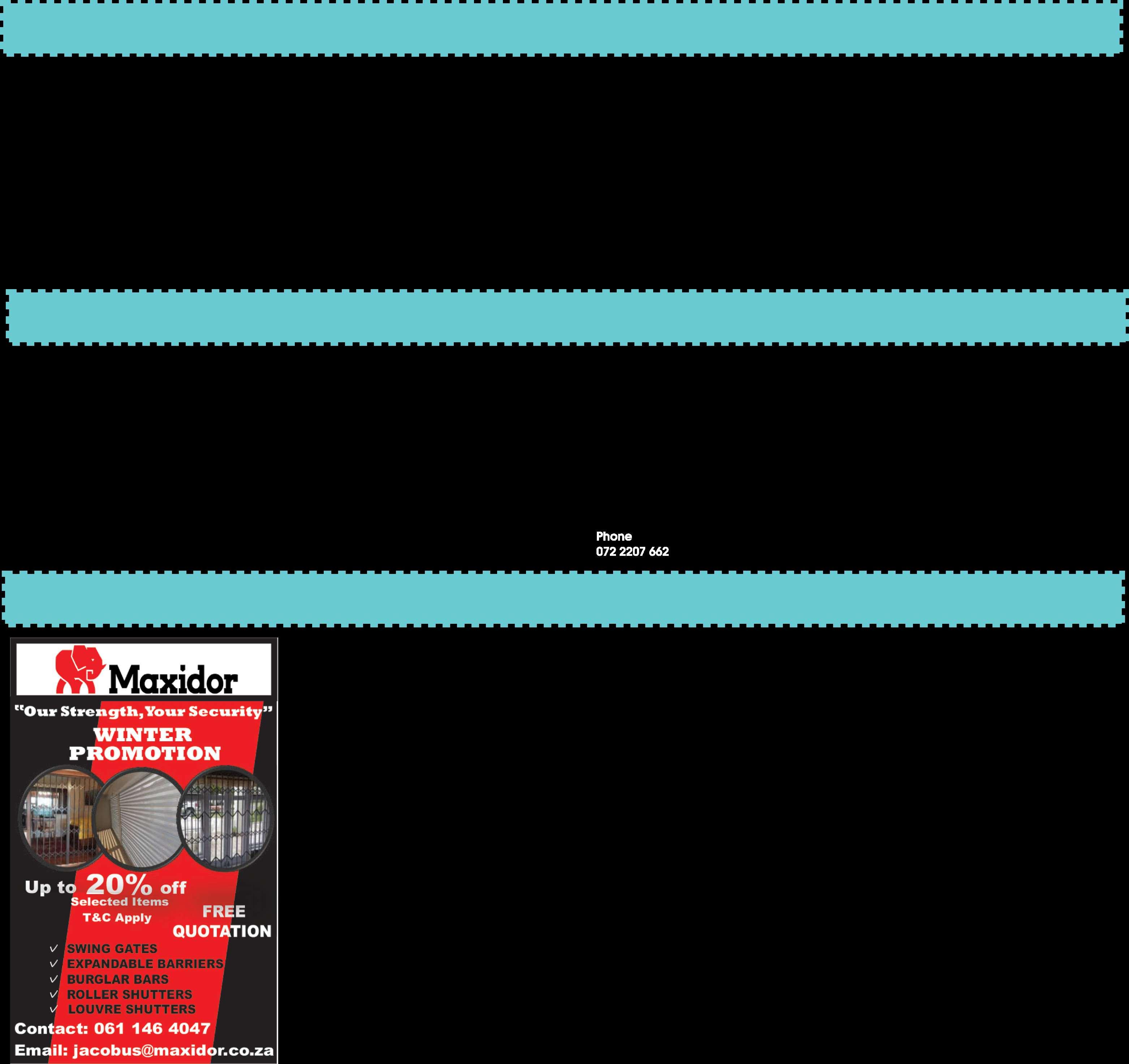 • Grow Strong is ’n Christenvaardigheid- en mentor-program met Mark en Brigit Oudejans aan die stuur om tieners te help om nuwe vaardighede te leer. Nog inligting: skakel 074158 9988 of 0680709340 of stuur e-pos na info@grow-strong.co.za.