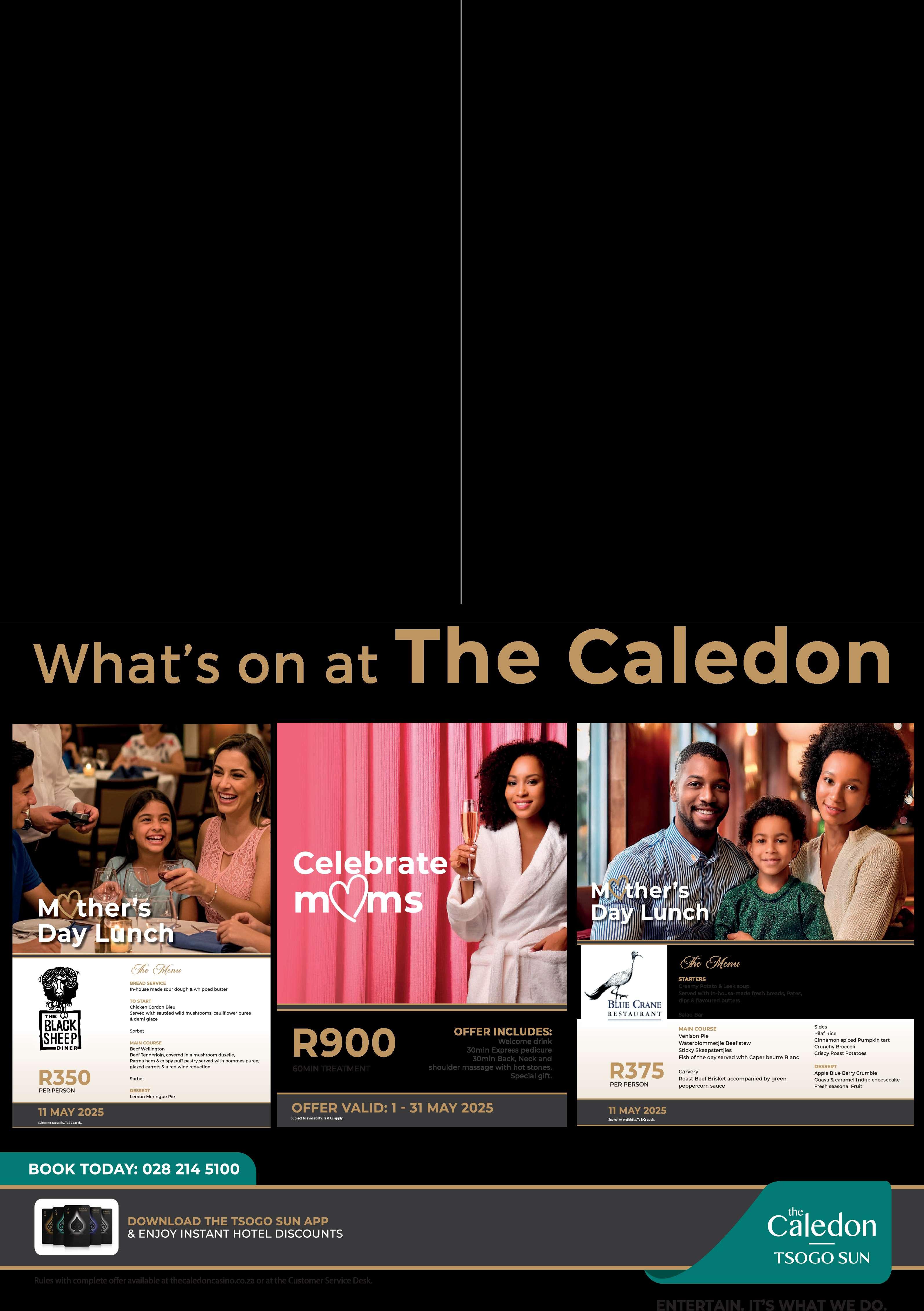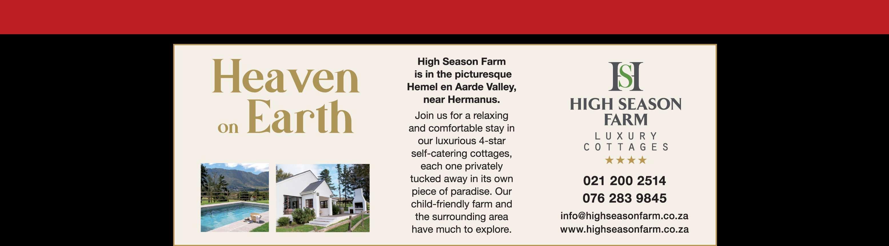 • We hear music on 14 June at the Dutch Reformed Church in Hermanus is a oneof-a-kind big band concert that will end this years’ programme of evening music. Inspired by local pop and jazz icons such as Miriam Makeba, Mango Groove, Abdullah Ibrahim, Zane Adams, audiences can expect a memorable performance.