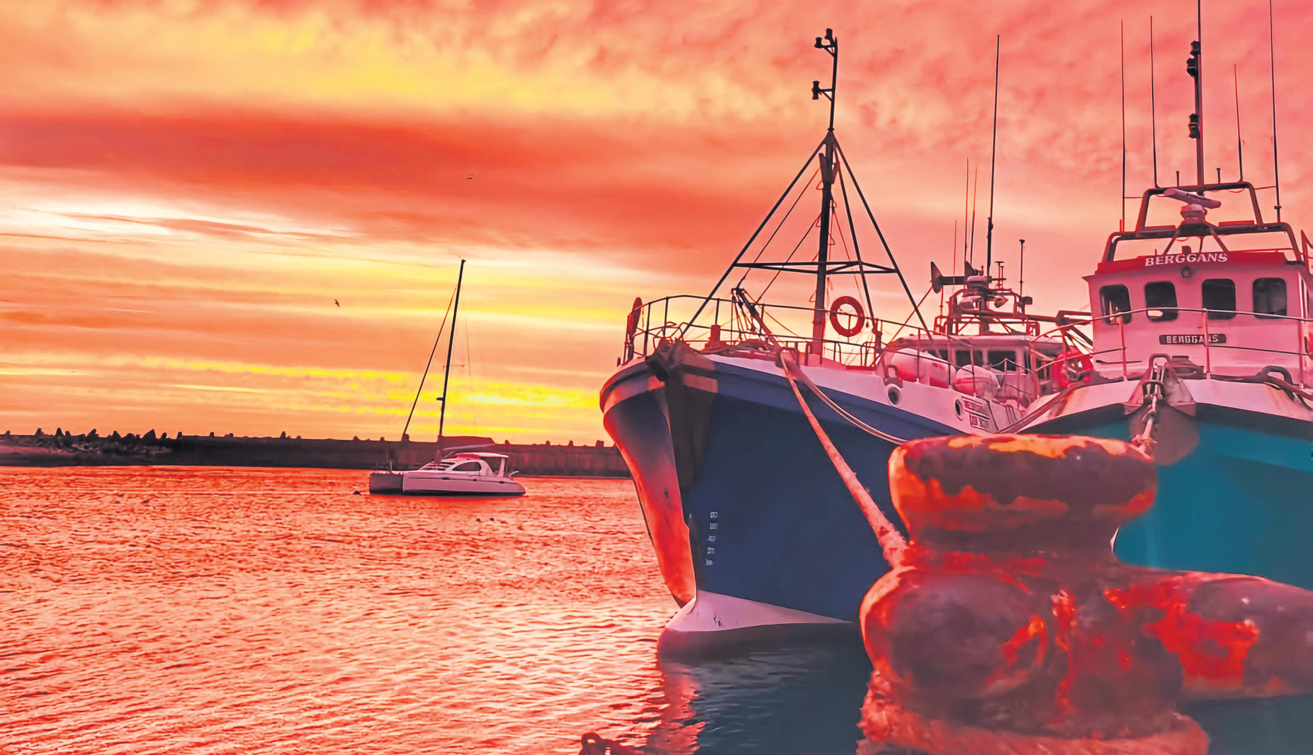 Die mooi sonsondergang in Gansbaai-hawe groet die dag. Dié foto laat ’n mens dink aan Totius se gedig “Die wereld is ons woning nie” waar hy skryf “Die wêreld is ons woning nie Dit merk ek aan die son wat wyk ” Foto: