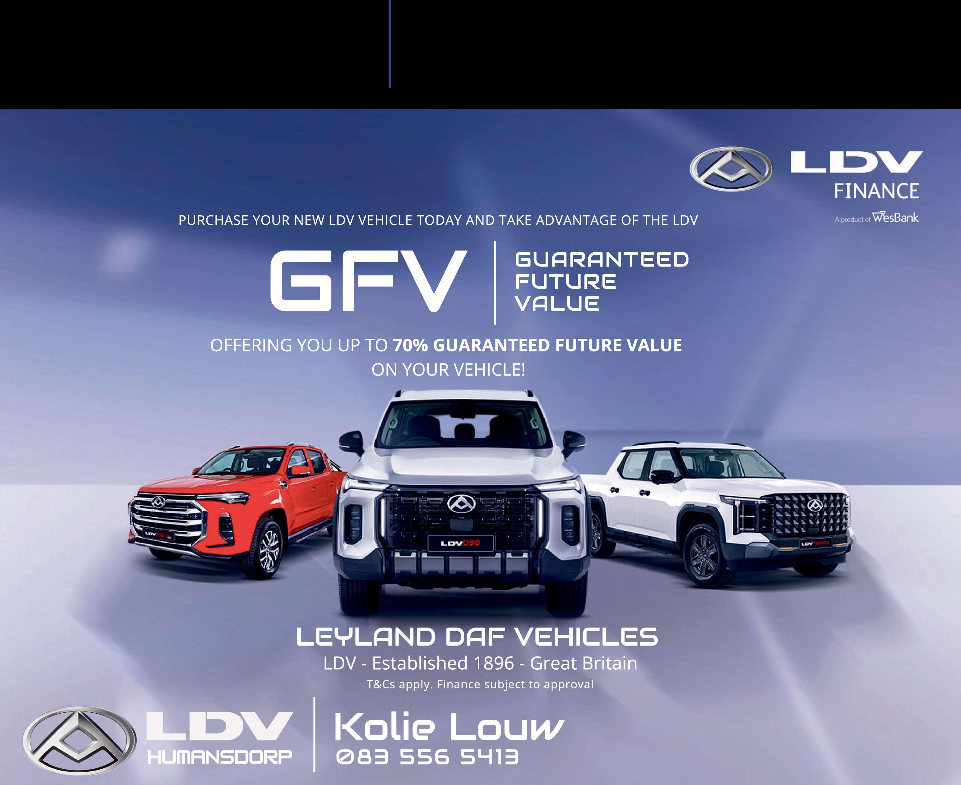 Boththe LDVTerron 9and D90are available throughWesbank Guaranteed Future Value(GFV) financing, making theseexceptional vehicles moreaffordablethaneverbefore. Witha Guaranteed Future Value