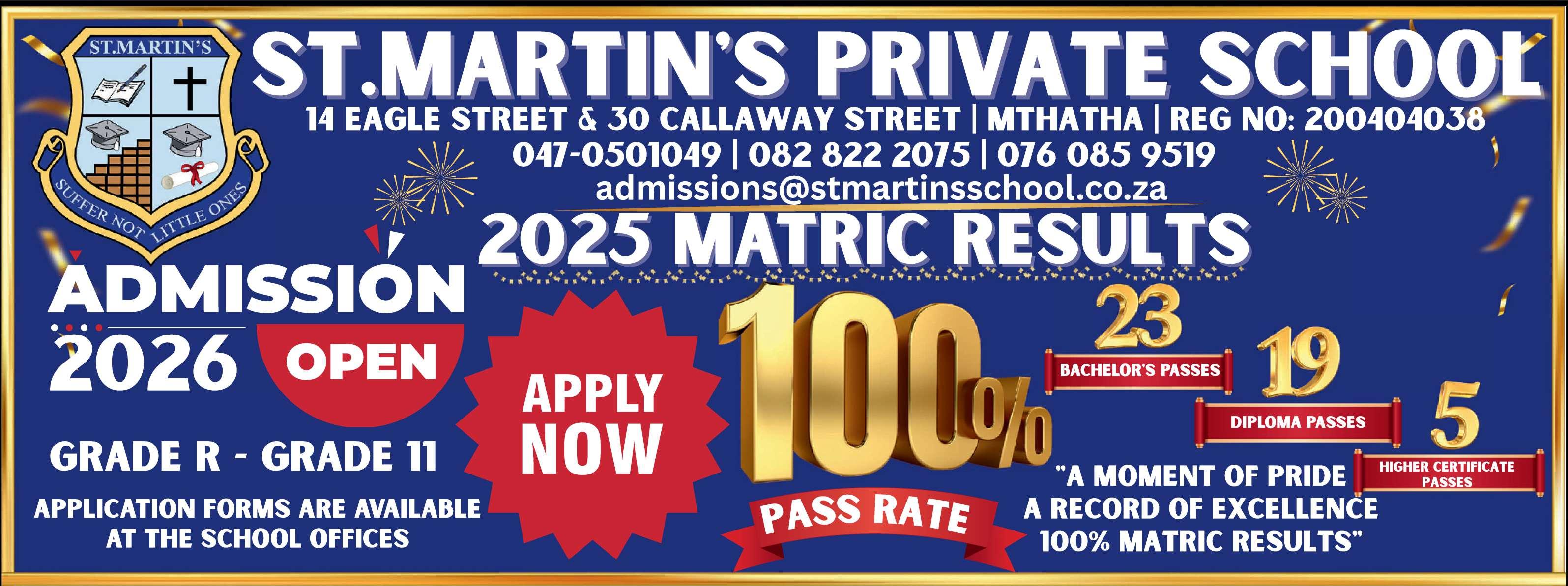 According to the 2025 NSCperformance report,onlyfiveschools in theEastern Cape achieved a100% pass rate.Within the OR TamboInlandDistrict, onlytwo schools attainedthisresult āStMartināsPrivate School beingone of them.