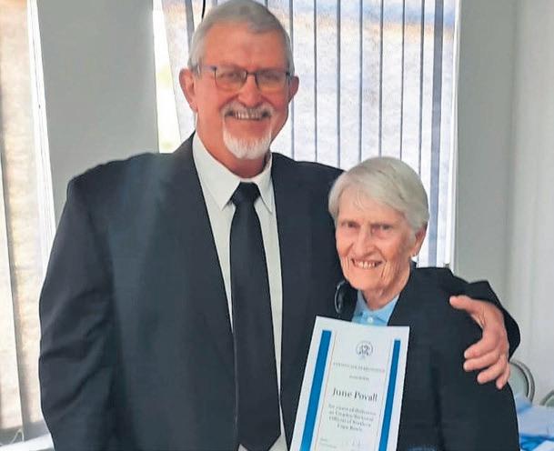 June Powall is op 90-jarige ouderdom nog aktief by rolbal betrokke. Saam met haar is Braam van der Westhuizen, president van Noord-Kaap Rolbal. Foto: Verskaf