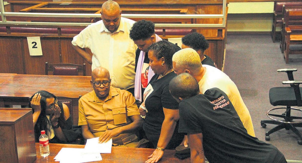 Adv.Leshnee Pillay,aanklaer,enafgetredelt.kol.DoggyMagugu,ondersoekbeampte, verduidelikaan Mandy Bailey se familieledewat die vonnisoplegging vanhaar moordenaar inhou.Die familielede is vanlinksClement Cupido,ErinCupido,Amy Topez,Ronel Bailey,Mark KotzeenWesleyBailey.FOTO:Charné Kemp