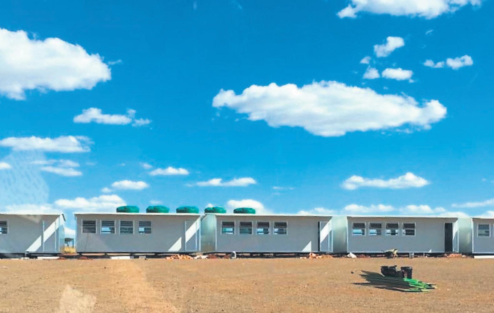 Thetemporaryclassrooms with watertanks visibleinthe background.No trees,for shade,orplaygroundwith grass canbeseenonthe premises PHOTO:Charné Kemp