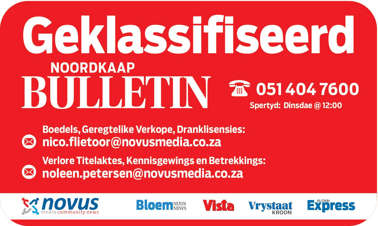 Die EERSTE EN FINALE LIKWIDASIE EN DISTRIBUSIEREKENING in bogemede boedel sal vir 'n tydperk van 21 dae vanaf 30 MEI 2025 ter insae lê by die kantoor van die Meester van die Hooggeregshof KIMBERLEY asook die Landdros POSMANSBURG . Indien binne gemeld e tydperk geen besware daarteen by die betrokke Meester ingedien word nie, gaan die eksekuteur oor tot die uitbetaling, ingevolge die rekening.