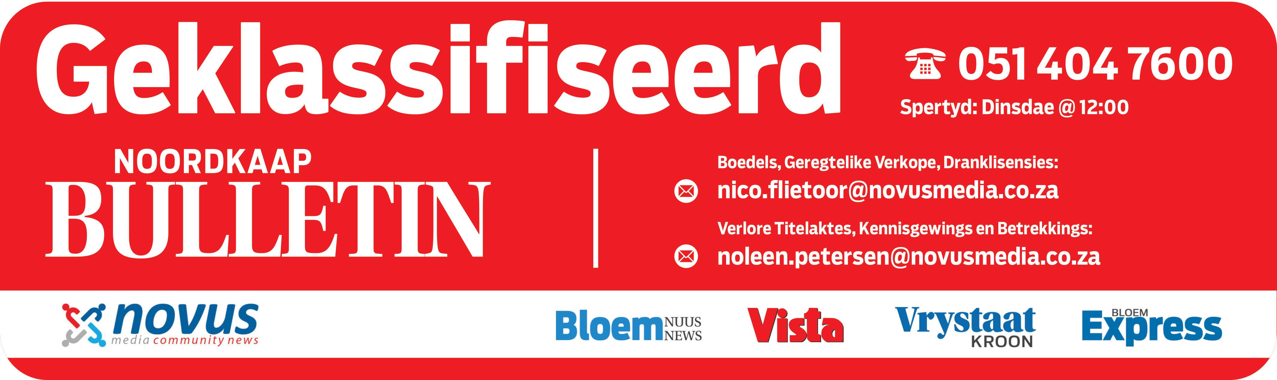 HENDRIK FRANCOIS VAN DEN BERG, met ID Nr. 620819 5006 08 8, wie gewoonlik woonagtig was te Bowker Straat 25, Douglas en wat oorlede is op 4 Junie 2024. Boedelnommer : 001983/2024. Kennis word hiermee gegee dat die Eerste en Finale Likwidasie - en Distribusierekening in bogemelde boedel ter insae sal lê ten kantore van die Meester van die Hooggeregshof KIMBERLEY en van die Landdros, DOUGLAS, vir 'n tydperk van 21 dae gereken vanaf datum van publikasie hiervan. Indien binne die genoemde tydperk geen besware daarteen by die Meester /Landdros of ondergenoemde ingedien word nie, sal die eksekutrise /eksekuteur oorgaan tot uitbetaling daarvolgens.