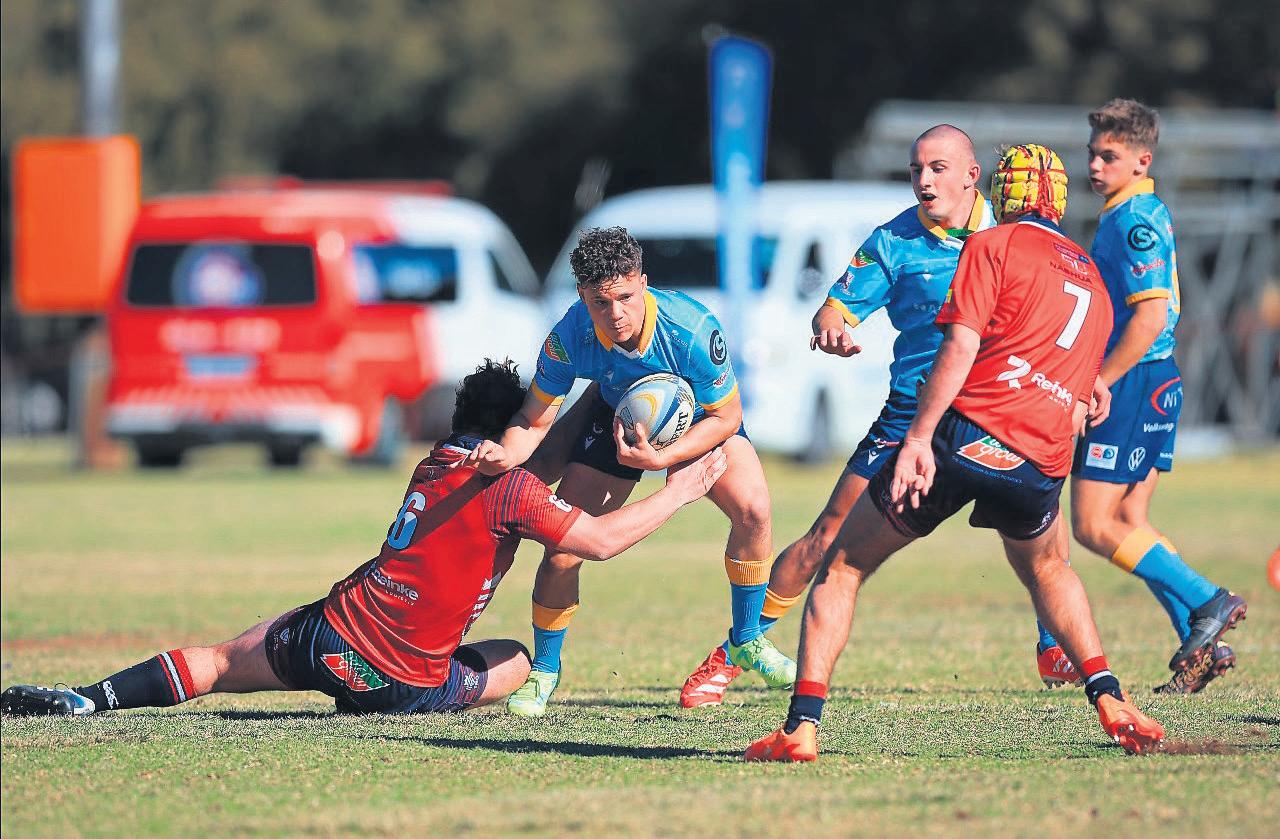 Die eersterugbyspan van die Hoërskool Diamantveld het as wenners van die veld afgestap tydens die naweek se Wesgrow-wedstryd teen die Hoërskool Trio. Keanu Metler het planne met die bal, terwyl Hennie Swanepoel en JG van Heerden hom ondersteun. Foto’s: Verskaf