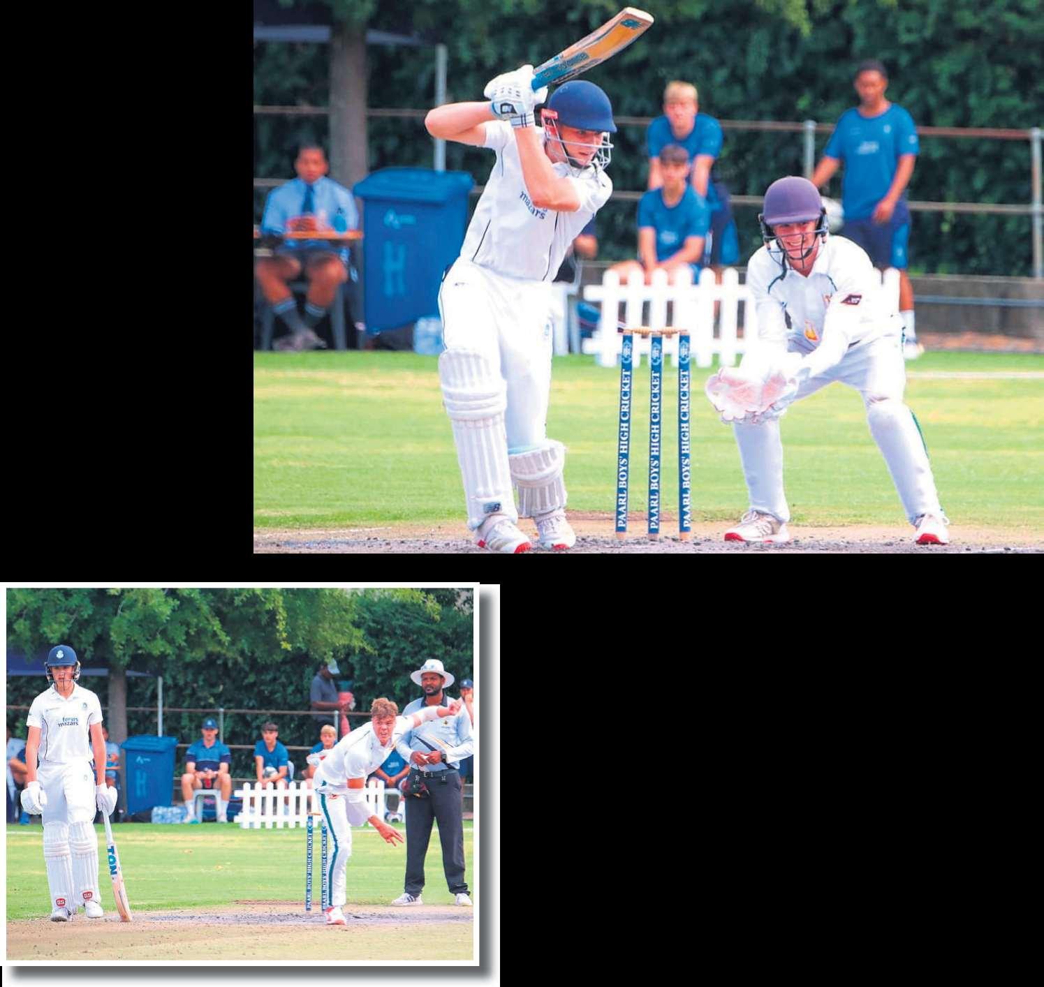 Roan Heyns (bo)wys sy slag voor die paaltjies. Die Hoërskool PaarlGimnasium en die Hoër Jongenskool Paarlhet Saterdag (28 Februarie)inhul jaarlikse krieketinterskolekragtegemeet.Boishaai hetdie loting gewen, gekies om eerstetekolf en is vir 113uitgeboul. Die lopiemakerswas Roan Heyns (36), ReesePetersen (25) en Ullrich Drotchie (12 nie uit nie). PaarlGimnasium hetdaarna voor die paaltjies ingeskuif en 115 lopies in 28 boulbeurte aangeteken en dus die kragmeting met drie paaltjies gewen.