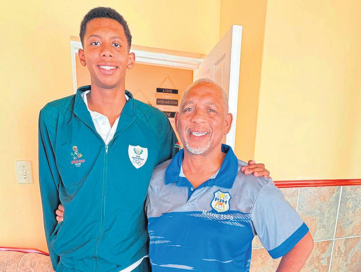 Whilethe rest of his peers were enjoyingthe holidayJayden Williams, achampion swimmer from Paarl, took part in the 4th AfricanYouth Games in Luanda, the capital of Angola. Theevent took place from 8till17Decemberand Jayden ropedinafew medals. Forthe 200m breaststrokehereceived gold; bronzefor the 50m breaststroke; and 4thplace for100m breaststroke. Jayden, whoisamatriculant at Paarl Boys’High this year,was also selected by Swimming South Africatobepart of adevelopment team who willundergo training at the high-performancecentre. Pictured withJayden is his coach, AdriaanKock.