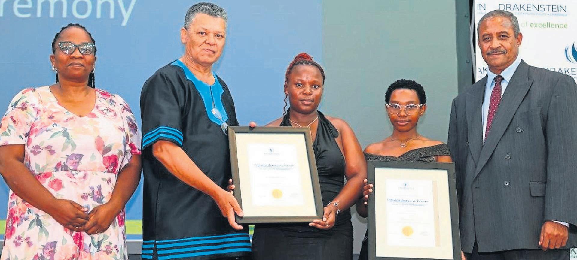 VanlinksisLCBhunguzana(IhlumeloSekondêreSkool; hoof), Micheal le Cordeur (emeritus professor in opvoedkunde aan die Universiteit Stellenbosch en voorsittervan die Stigting virBemagtiging deur Afrikaans), Asezile GwazaenTinzi Sinovuyo(beide IhlumeloSekondêreSkool-matrikulante) en Stephen Korabie,die burgemeester vandie Drakenstein-munisipaliteit. Foto:Drakenstein-munisipaliteit/ Facebook