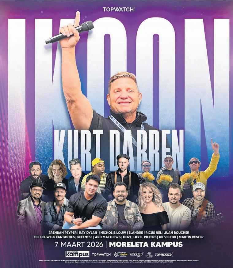 ’n Advertensie van die Ikoon-konsert op 7 Maart 2026, waar Kurt Darren sou optree, maar wat nou gekanselleer is Foto: Facebook