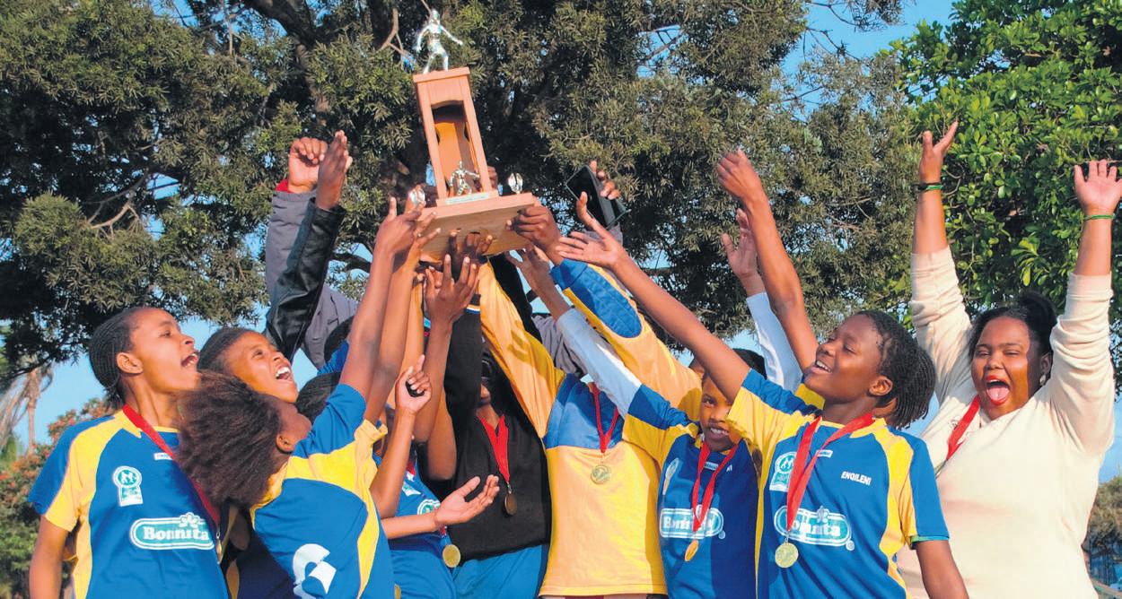 Enqileni Primary’s u/15 girls are in a happy mood after winning the finals