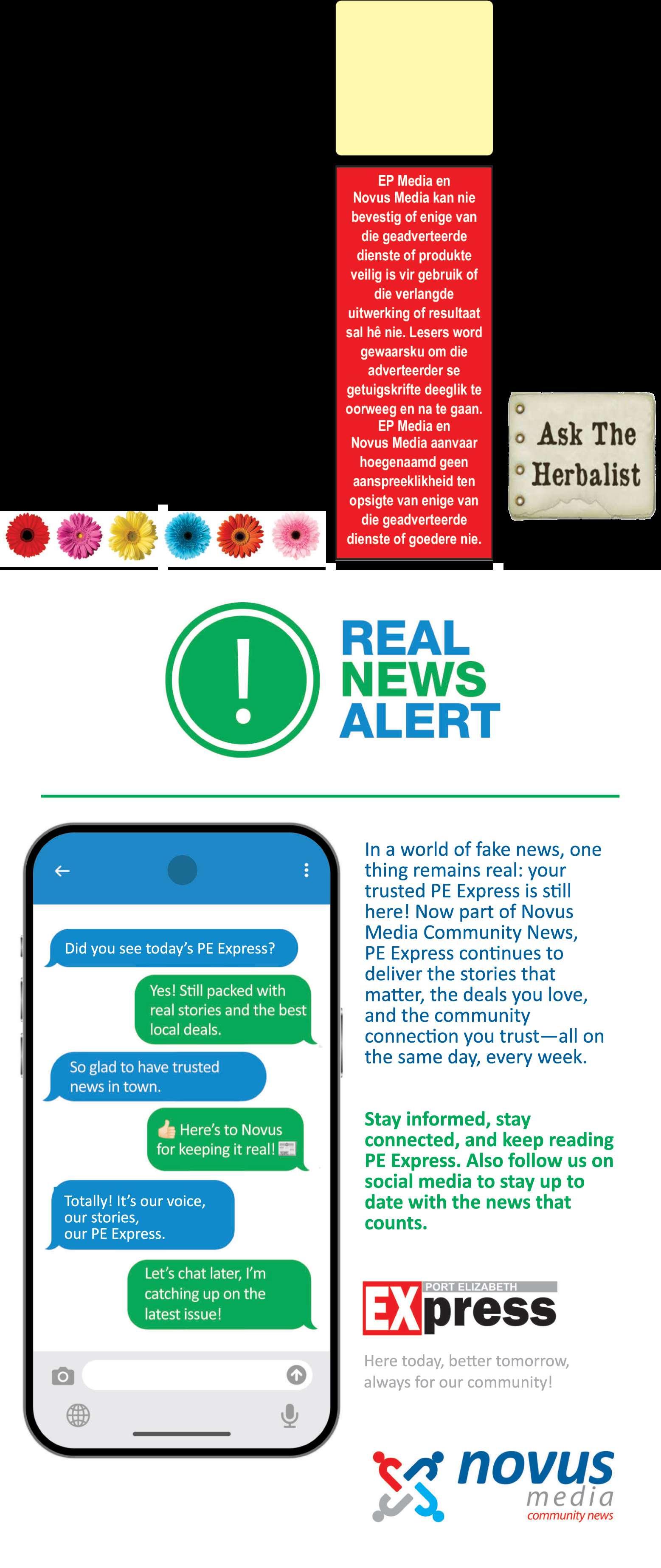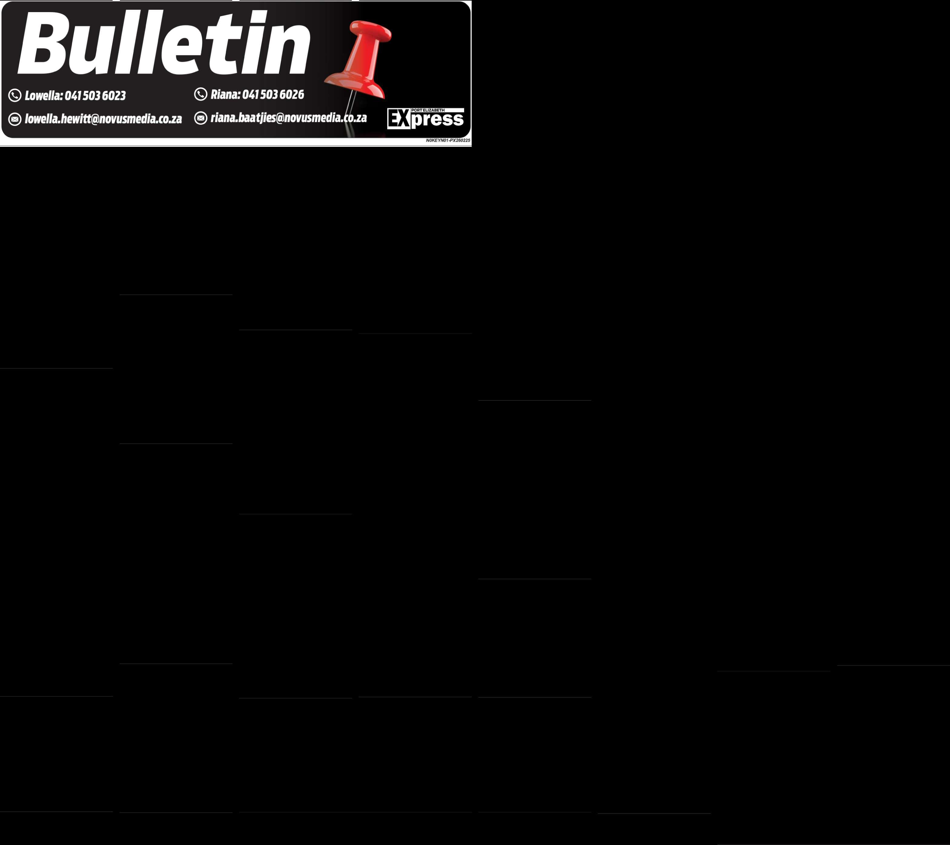 PLEASENOTE: Newspaperdelivery complaintsshouldbe sent to peexpress@novusmedia.co.za.Include your delivery addressand contactnumber