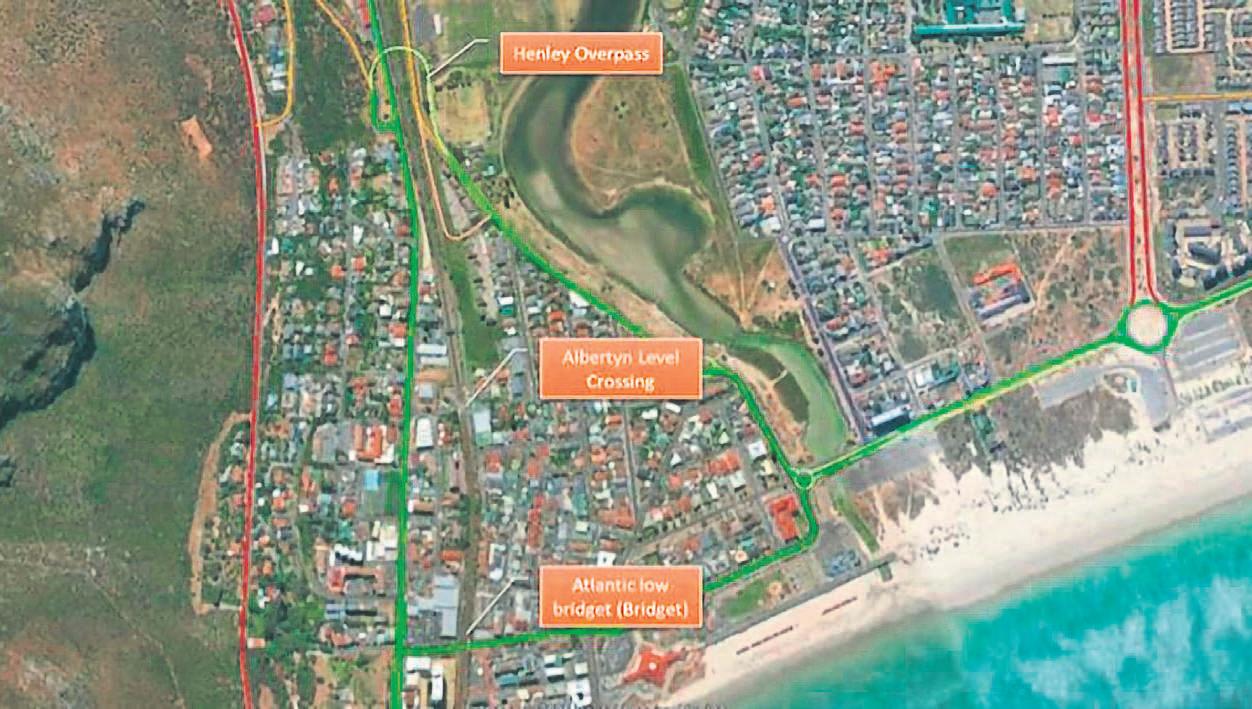 “Further, as part of the current congestion alleviation project in Muizenberg, the technical team investigated the feasibility of eliminating the Albertyn Road rail level crossing by means of a grade separated structure (Henley Overpass) The outcome of the study revealed that the overpass was geometrically achievable The overpass was not continued through to preliminary design and the associated statutory approvals (environmental and heritage), but it was recommended that a new project be commissioned to explore the options of eliminating the Albertyn Road rail level crossing This Level Crossing Elimination (LCE) project should, at least, include raising the rail bridge/
