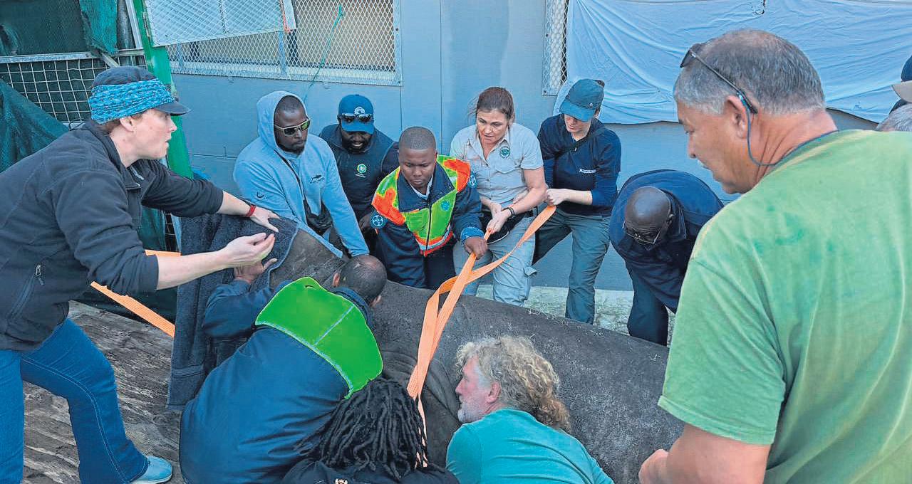 Once given the go-ahead by the vets, the animal was carefully rolled onto a stretcher and with a combination of many hands and a well-coordinated effort the almost 1,2 ton animal was carefully and quickly loaded into the trailer without a hitch The animal's welfare was checked by the vets before travelling to the selected release site at the Steenbras Nature