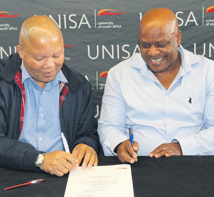 Advokaat Mandisi Planga, ’n oud-Unisastudent en die BVM se Direkteur van gemeenskapsdienste onderteken die memorandum saam met Unisa se Kaapse streekdirekteur, Nkgoang Motale Foto: Breedevallei-munisipaliteit