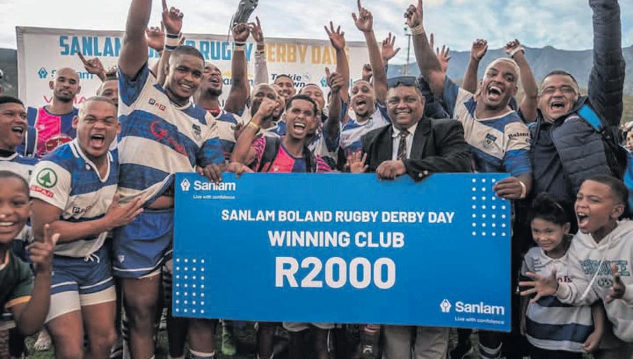DieRobertsonTown-spannadathysybuurmanengasheervirdiedag,RangersRobertson,inhulSanlam-Boland-rugbyderby-wedstrydmet51-19afgeslaghet Diekragmeting isindieVanZylstraat-stadionbeslis TweedevanlinksopdiefotoisJumainuineArendse (Townsekaptein)enderdevanregsElroyMatthys,’nBoland-amptenaar,watdiewenprysoorhandighet Foto: Robertson Rugby Football Club Facebookblad