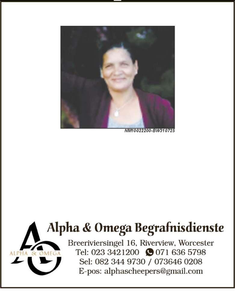 Begrafnisdiens vind plaas Saterdag, 02 Augustus 2025 om 11:00 by Thomasstraat 24, Victoriapark en om 12:00, by V.G.K Sentraal Kerk, Adderleystraat. Mammie wat ons Meester gedoen het is welgedaan. U is verlos. Mis jou moederlike liefde alreeds. Rus in vrede. Shalom. Ashwil, Sonja, Luzal, Jerome, al jou kleinkinders en agter kleinkinders