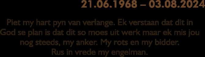 Dit is met diepe hartseer dat ons die afsterwe van ons geliefde Pa, man en oupa aankondig wat na 'n dapper stryd teen kanker oorlede is. Jou vrou, kinders en breë familie