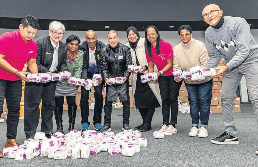 By die oorhandiging van SPAR se sanitêredoekieprojek is van links Lindsay Adams (stigter: Against Period Poverty), Elsabe van Zyl-Felix (advertensiebestuurder: SPAR Wes-Kaap), Sheila Moonsamy (Human Rights Screen Foundation), James Albanie (BVCA Dignity Project), dr Boebie Hamzam (Malikah-stigting en -hokkie-owerheid), Fuyzlin Hassan Kevy (WP-krieketveterane), Lindsay Lindt (sekretaris: APP), Ellen Adams (APP-vrywilliger) en Omar Henry (voormalige SA krieketspeler en ondersteuner van die BVCA-projek).