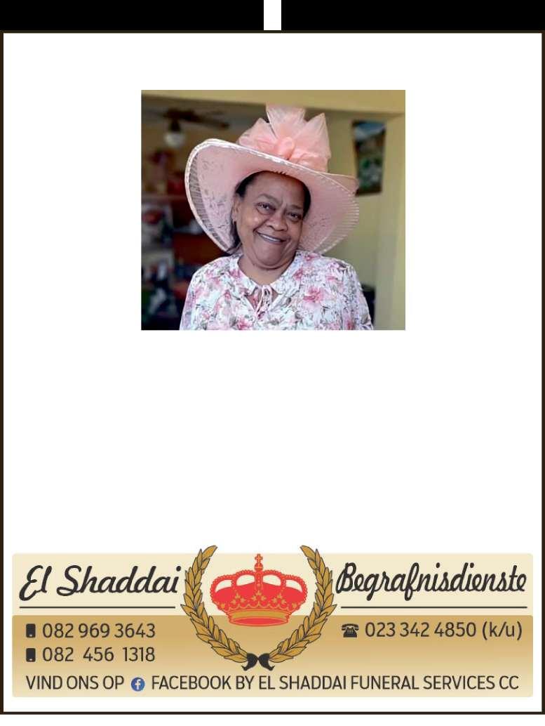 Begrafnisdiens vind plaas Saterdag, 26 Julie 2025 om 09:00 by Danielstraat 167, Roodewal en om 10:00 vanuit VGK Worcester-Oos, Fischerstraat