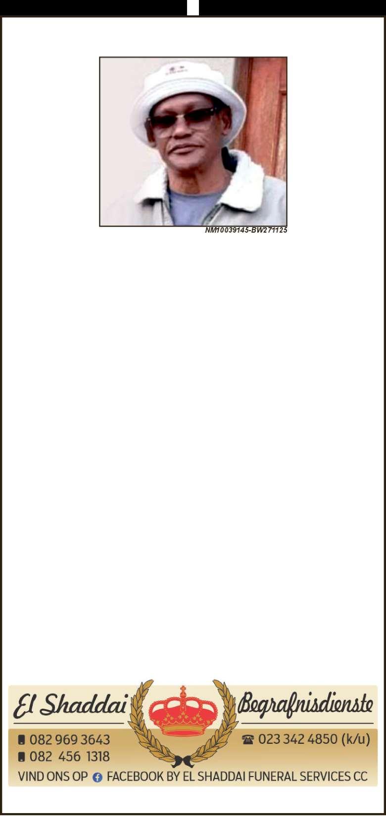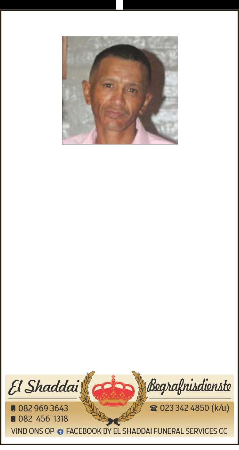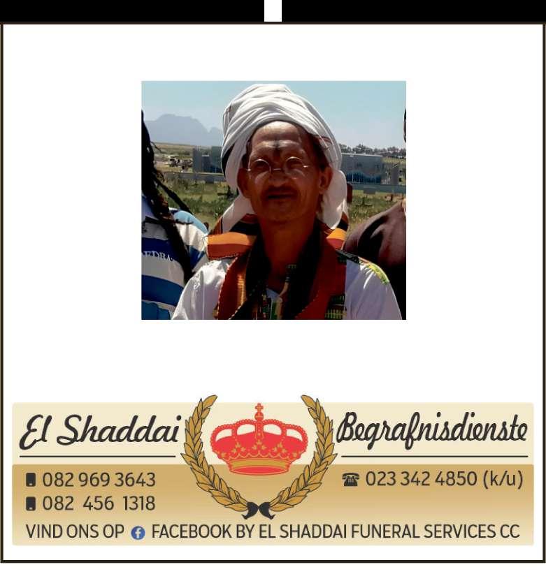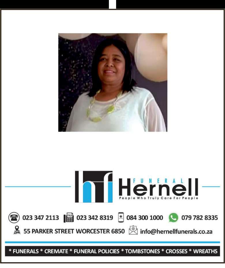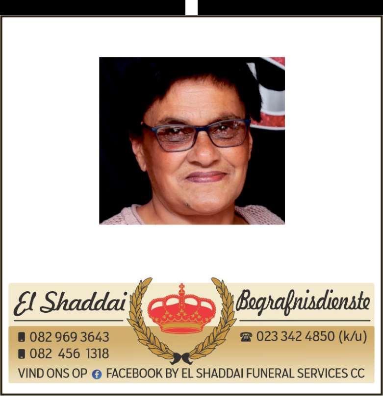Begrafnisdiens vind plaas Saterdag, 29 November 2025 om 11:00 by Klipdalstraat 12, De Doorns en om 12:00 vanuit AME Kerk, Violetstraat, De Doorns.